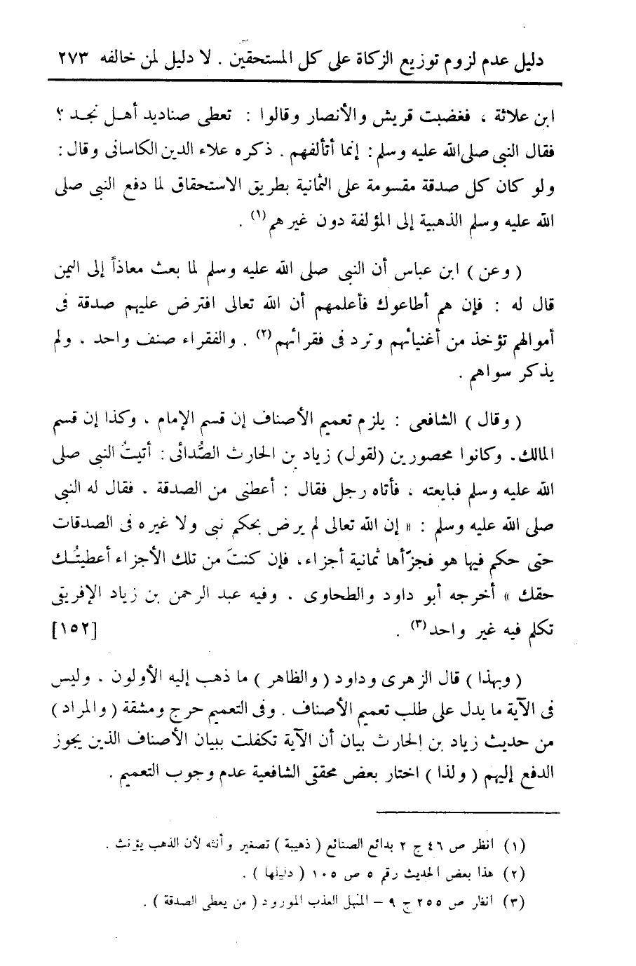 (وبهذا) قال الزهري وداود (والظاهر) ما ذهب إليه الأولون، وليس في الىية ما يدل على طلب تعميم الأصناف. وفي التعميم حرج ومشقة (والمراد) من حديث زياد بن الحارث بيان أن الآية تكفلت ببيان الأصناف الذين يجوز الدفع إليهم (ولذا) اختار بعض محققي الشافعية عدم وجوب التعميم.