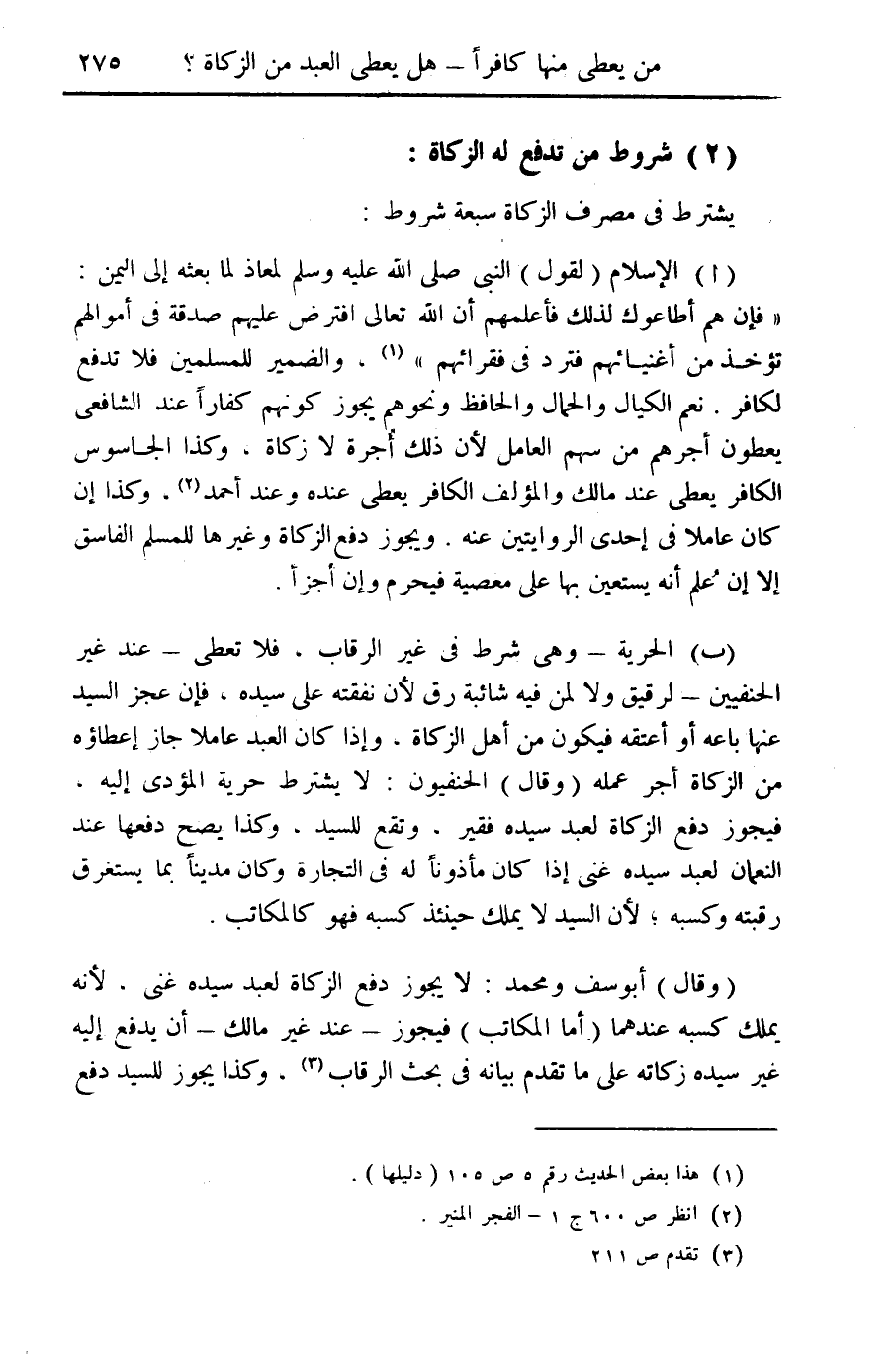 (ب) الحرية- وهي شرط في غير الرقاب، فلا تعطي- عند غير الحنفيين- لرقيق ولا لمن فيه شائبة رق لأن نفقته على سيده، فإن عجز السيد عنها باعه أو أعتقه فيكون من أهل الزكاة، وإذا كان العبد عاملا جاز إعطاؤه من الزكاة أجر عمله (وقال) الحنفيون: لا يشترط حرية المؤدى إليه، فيجوز دفع الزكاة لعبد سيده فقير، وتقع للسيد، وكذا يصح دفعها عند النعمان لعبد سيده غنى إذا كان مأذونا له في التجارة وكان مدينا بما يستغرق رقبته وكسبه؛ لأن السيد لا يملك حينئذ كسبه فهو كالمكاتب.