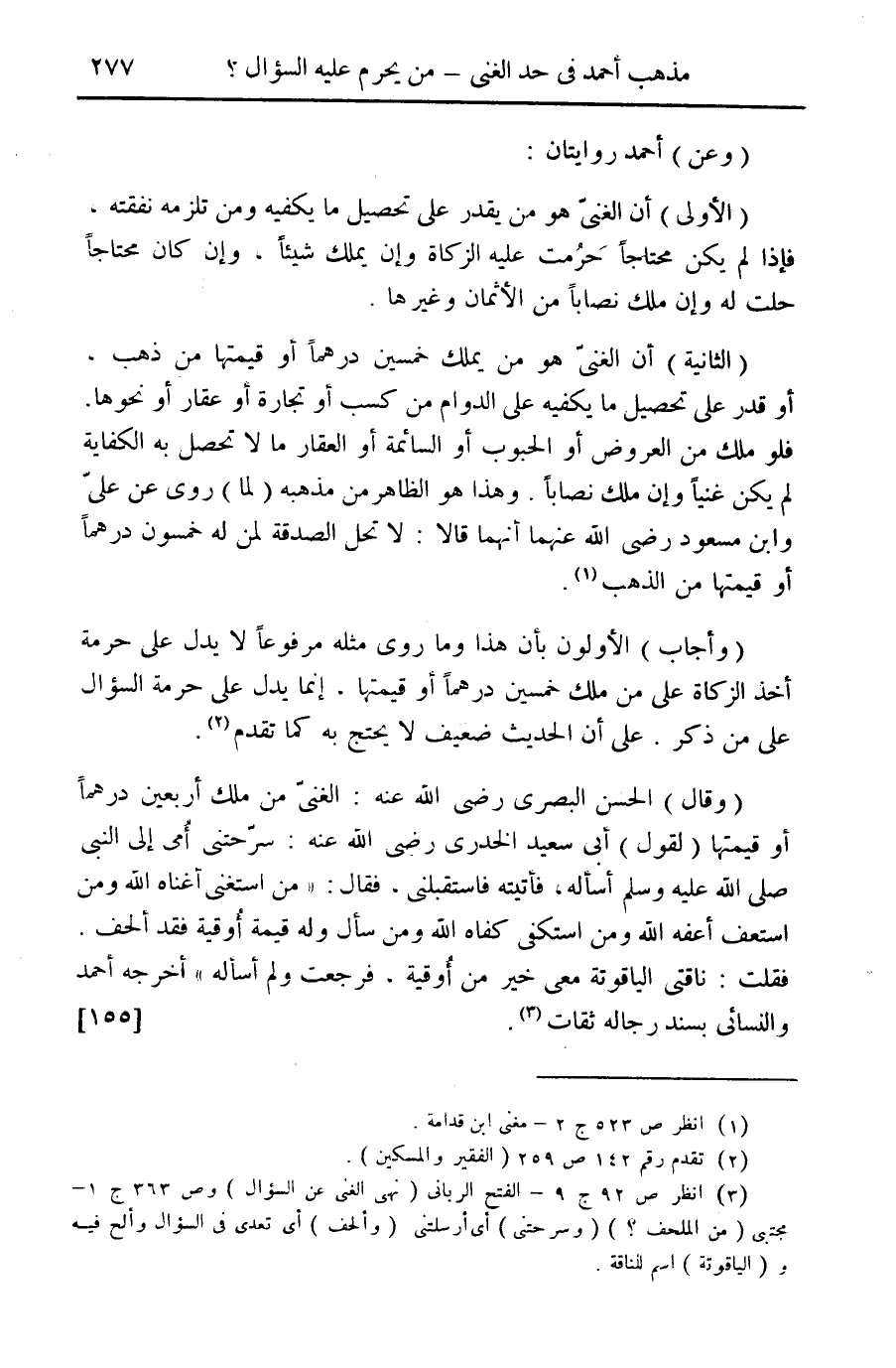 ... (وقال) الحسن البصرى رضى الله عنه: الغنى من ملك اربعين درهما أو قيمتها (لقول) أبى سعيد الخدرى رضى الله عنه: سرحتى امى الى النبى صلى الله عليه وسلم أسأله، فأتيته فاستقبلنى، فقال: " من استغنى اغناه الله ومن استعف أعفه الله ومن استكفى كفاه الله ومن سال وله قيمه أو قية فقد ألحف.