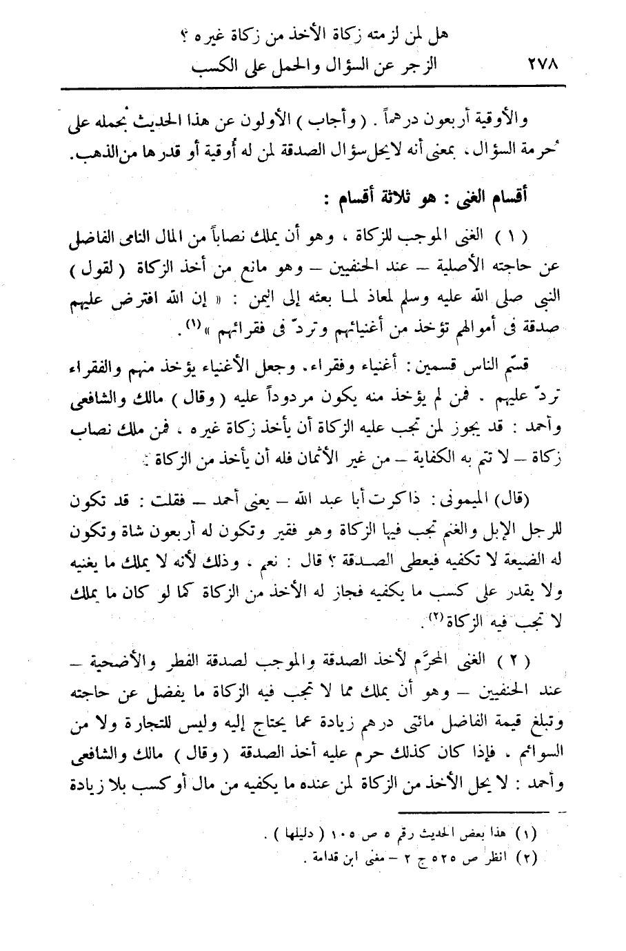 (2) الغنى المحرم لأخذ الصدقة والموجب لصدقة الفطر والأضحية - عند الحنفيين - وهو أن يملك مما لا تجب فيه الزكاة ما يفضل عن حاجته وتبلغ قيمة الفاضل مائتى درهم زيادة عما يحتاج اليه وليس للتجارة ولا من السوائم، فاذا كان كذلك حرم عليه أخذ الصدقة (وقال) مالك والشافعى وأحمد: لا يحل الأخذ من الزكاة لمن عنده ما يكفيه من مال أو كسب بلا زيادة