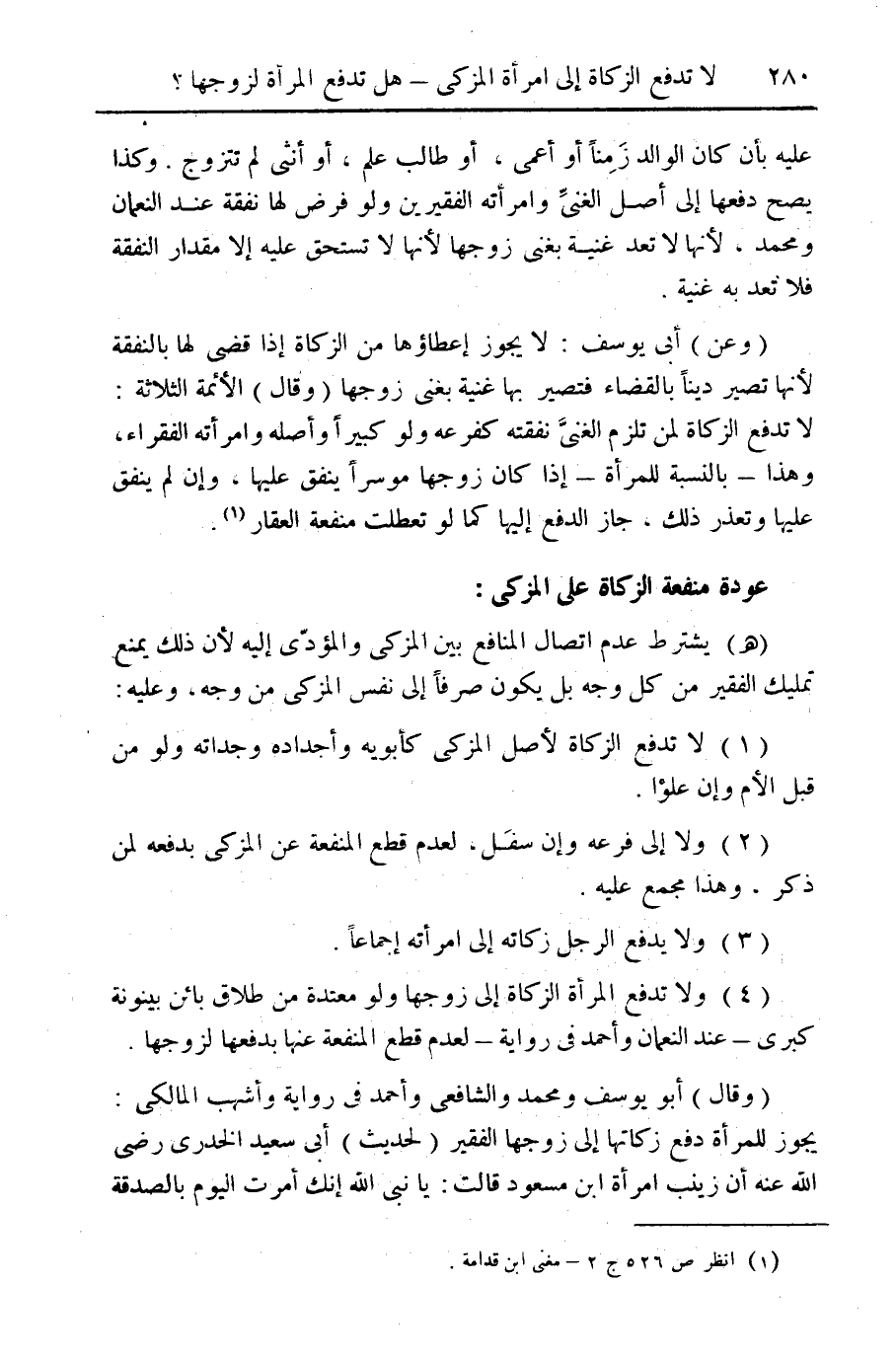 (4) ولا تدفع المرأة الزكاة الى زوجها ولو معتدة من طلاق بائن بينونة كبرى - عند النعمان وأحمد فى روايه - لعدم قطع المنفعه عنها بدفعها لزوجها.