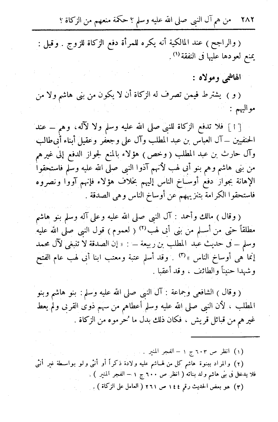 (¬2) والمراد ببنوة هاشم كل من لهاشم عليه ولادة ذكرا أو أنثى ولو بواسطة غير انى فلا يدخل فى بنى هاشم ولد بناته (أنظر من 600 ج 1 - الفجر المنير).