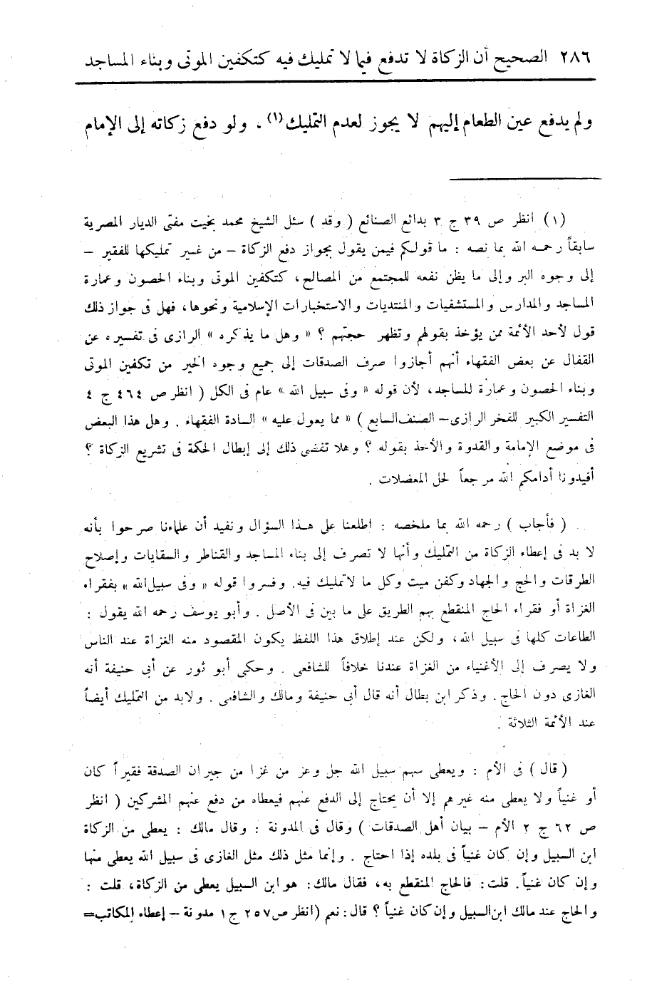 (¬1) انظر ص 39 ج 3 بدائع الصنائع (وقد) سئل الشيخ محمد بخيث مفتي الديار المصرية سابقا رحمه الله بما نصه: ما قولكم فيمن يقول بجواز دفع الزكاة- من غير تمليكها للفقير- إلى وجوه البر وغلى ما يظن نفعه للمجتمع من المصالح، كتكفين الموتى وبناء الحصون وعمارة المساجد والمدارس والمستشفيات والمنتديات والاستخبارات الإسلامية ونحوها، فهل في جواز ذلك قول لأحد الأئمة ممن يؤخذ بقولهم وتظهر حجتهم؟ "وهل ما يذكره" الرازي في تفسيره عن القفال عن بعض الفقهاء أنهم أجازوا صرف الصدقات إلى جميع وجوه الخير من تكفين الموتى وبناء الحصون وعمارة للمساجد، لأن قوله "وفي سبيل الله" عام في الكل (أنظر ص 464 ج 4 التفسير الكبير للفخر الرازي- الصنف السابع) "مما يعول عليه" السادة الفقهاء. وهل هذا البعض في موضع الإمامة والقدوة والأخذ بقوله؟ وهلا تقضي ذلك إلى إبطال الحكمة في تشريع الزكاة؟ أفيدونا أدامكم الله مرجعا لحل المعضلات.