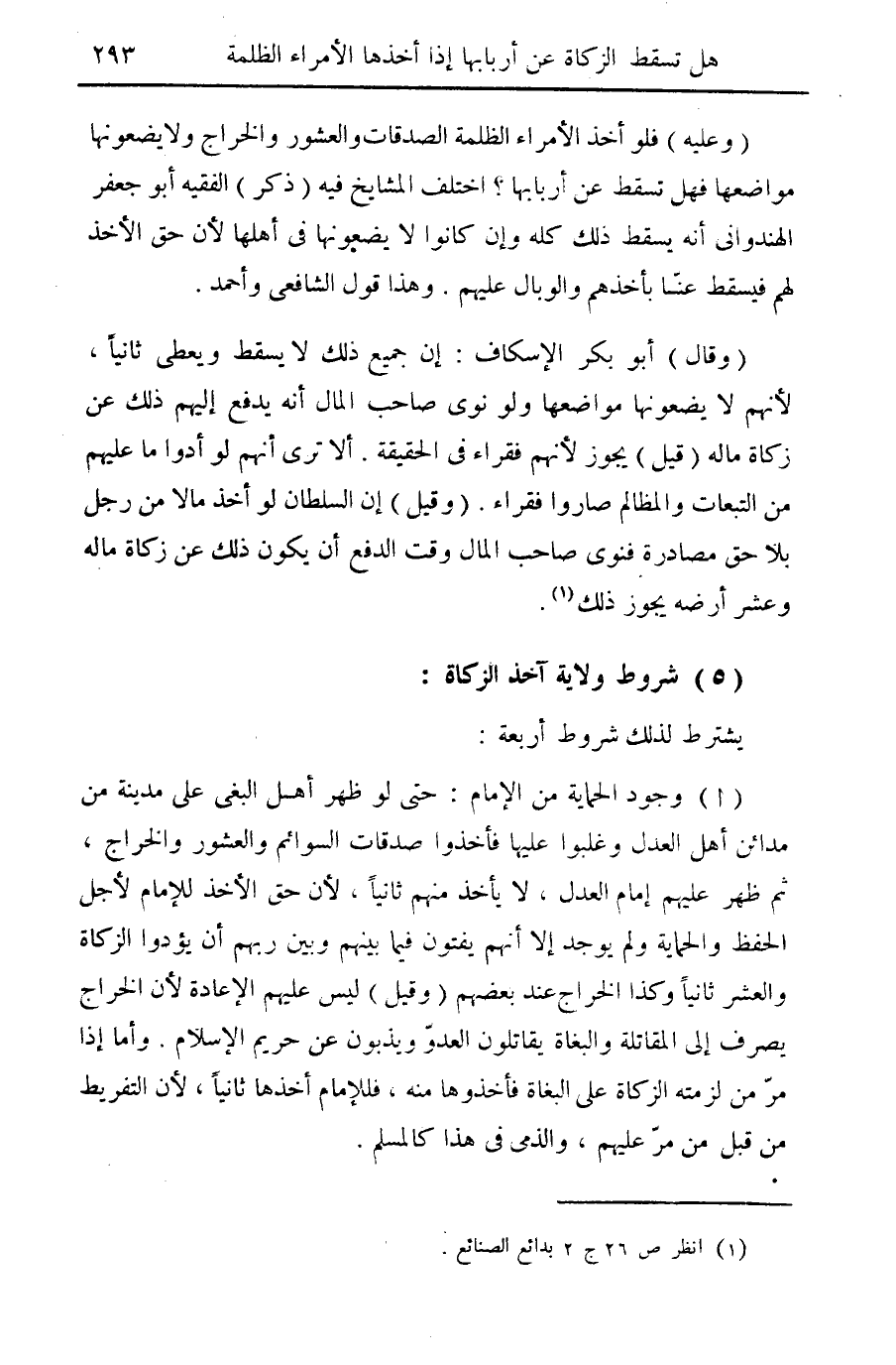 (أ) وجود الحماية من الإمام: حتى لو ظهر أهل البغي على مدينة من مدائن أهل العدل وغلبوا عليها فأخذوا صدقات السوائم والعشور والخراج، ثم ظهر عليهم إمام العدل، لا يأخذ منهم ثانيا، لأن حق الأخذ للإمام لأجل الحفظ والحماية ولم يوجد إلا أنهم يفتون فيما بينهم وبين ربهم أن يؤدوا الزكاة والعشر ثانيا وكذا الخراج عند بعضهم (وقيل) ليس عليهم الإعادة لأن الخراج يصرف على المقاتلة والبغاة يقاتلون العدو ويذبون عن حريم الإسلام. وأما إذا مر من لزمته الزكاة على البغاة فأخذوها منه، فللإمام أخذها ثانيا، لأن التفريط من قبل من مر عليهم، والذمي في هذا كالمسلم.