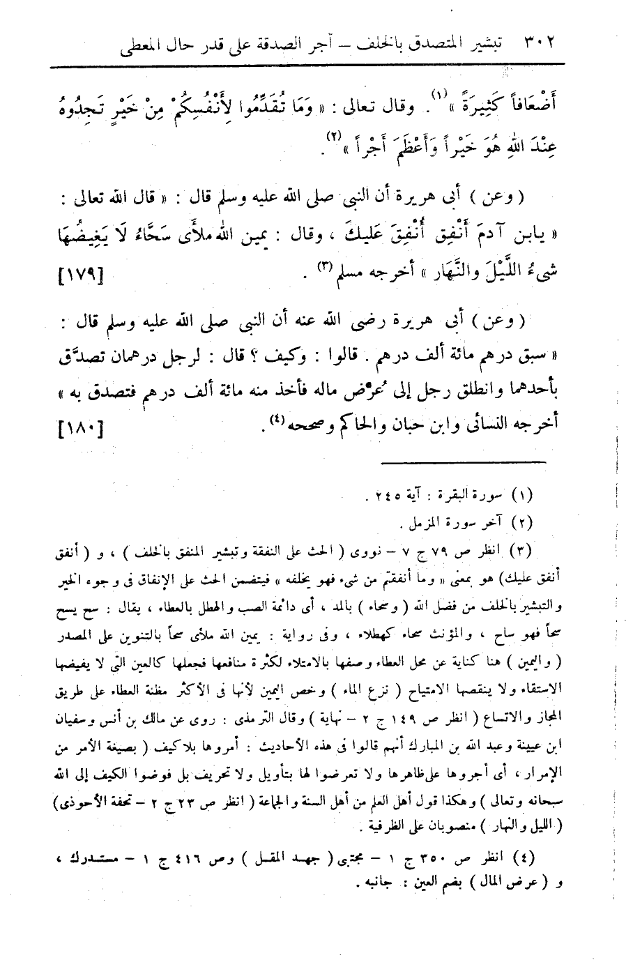 (¬3) انظر ص 79 ج 7 - نووي (الحث على النفقة وتبشير المنفق بالخلف)، و (أنفق أنفق عليك) هو بمعنى "وما أنفقتم من شيء فهو يخلفه" فيتضمن الحث على الإنفاق في وجوه الخير والتبشير بالخلف من فضل الله (وسحاء) بالمد، أي دائمة الصب والهطل بالعطاء، يقال: سح يسح سحا فهو ساح، والمؤنث سحاء كهطلاء، وفي رواية: يمين الله ملأي سحا بالتنوين على المصدر (واليمين) هنا كناية عن محل العطاء وصفها بالامتلاء لكثرة منافعها فجعلها كالعين التي لا يفيضها الاستقاء ولا ينقصها الامتياح (نزع الماء) وخص اليمين لأنها في الأكثر مظنة العطاء على طريق المجاز والاتساع (أنظر ص 149 ج 2 - نهاية) وقال الترمذي: روى عن مالك بن أنس وسفيان ابن عيينة وعبد الله بن المبارك أنهم قالوا في هذه الأحاديث: أمروها بلا كيف (بصيغة الأمر من الإمراء، أي أجروها على ظاهرها ولا تعرضوا لها بتأويل ولا تحريف بل فوضوا الكيف على الله سبحانه وتعالى) وهكذا قول أهل العلم منن أهل السنة والجماعة (انظر ص 23 ج 2 - تحفة الأحوذي) (الليل والنهار) منصوبان على الظرفية.