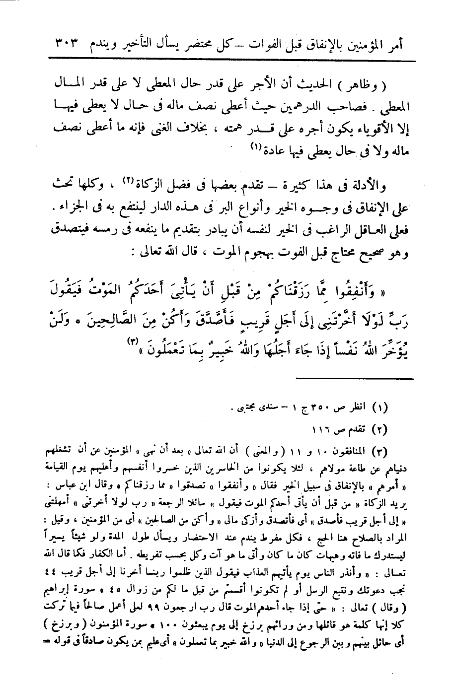 (¬3) المنافقون 10 و 11 (والمعنى) أن الله تعالى "بعد ان نهى" المؤمنين عن أن تشغلهم دنياهم عن طاعة مولاهم، لئلا يكونوا من الخاسرين الذين خسروا أنفسهم وأهليهم يوم القيامة "أمرهم" بالإنفاق في سبييل الخير فقال "وأنفقوا" تصدقوا "مما رزقناكم" وقال ابن عباس: يريد الزكاة "من قبل أن يأتي أحدكم الموت فيقول" سائلا الرجعة "رب لولا أخرتني" أمهلتني "إلى أجل قريب فأصدق" أي فأتصدق وأزكي مالي "وأكن من الصالحين" أي من المؤمنين، وقيل: المراد بالصلاح هنا الحج، فكل مفرط يندم عند الاحتضار ويسأل طول المدة ولو شيئا يسيرا ليستدرك ما فاته وهيهات كان ما كان واتى ما هو آت وكل بحسب تفريطه. أما الكفار فكما قال الله تعالى: "وأنذر الناس يوم يأتيهم العذاب فيقول الذين ظلموا ربنا أخرنا إلى أجل قريب 44 نجب دعوتك ونتبع الرسل أو لم تكونوا أقسمتم من قبل ما لكم من زوال 45" سورة إبراهيم (وقال) تعالى: "حتى إذا جاء أحدهم الموت قال رب ارجعون 99 لعلى أعمل صالحا فيما تركت كلا إنها كلمة هو قائلها ومن ورائهم برزخ على يوم يبعثون 100" سورة المؤمنون (وبرزخ) أي حائل بينهم وبين الرجوع إلى الدنيا "والله خبير بما تعملون" أي عليم بمن يكون صادقا في قوله وسؤاله ومن لو ردوا لعادوا إلى شر مما كانوا عليه (قال) ابن عباس رضي الله عنهما: من كان له مال يبلغه حج بيت ربه أو يجب عليه فيه زكاة فلم يفعل يسأل ارجعة عند الموت، فقال رجل: يا بن عباس اتق الله فإنما يسأل الرجعة الكفار، فقال: سأتلو عليكم بذلك قرآنا: "يا أيها الذين آمنوا لا تلهكم أموالكم ولا أولادكم عن ذكر الله ومن يفعل ذلك فأولئك هم الخاسرون، وأنفقوا مما رزقناكم .... " إلخ السنرة أخرجه الترمذي وقال: حدثنا عبد بن حميدنا عبد الرزاق عن الثوري عن يحيى بن أبي حية عن الضحاك عن ابن عباس عن النبي صلى الله عليه وسلم بنحوه. هكذا روى ابن عيينة وغير واحد هذا الحديث عن ابي جناب عن الضحاك عن ابن عباس من قوله ولم يرفعه، وهذا أصبح من رواية عبد الرزاق (وأبو جناب) اسمه يحيى بن أبي حية وليس بالقوى في الحديث (انظر ص 202 ج 4 - تحفة الأحوذي- سورة المنافقون).