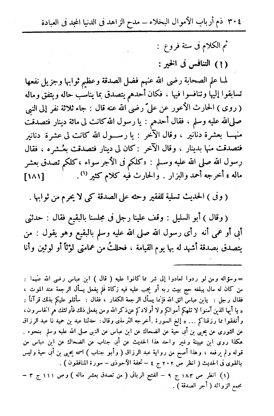 لما علم الصحابة رضي الله عنهم فضل الصدقة وعظيم ثوابها وجزيل نفعها تسابقوا إليها وتنافسوا فيها. فكان أحدهم يتصدق بما يناسب حاله ويتفق وماله (روى) الحارث الأعور عن علي رضي الله عنه قال: جاء ثلاثة نفر إلى النبي صلى الله عليه وسلم، فقال أحدهم: يا رسول الله كانت لي مائة دينار فتصدقت منها بعشرة دنانير، وقال الآخر: يا رسول الله كانت لي عشرة دنانير فتصدقت منها بدينار، وقال الآخر: كان لي دينار فتصدقت بعشرة، فقال رسول الله صلى الله عليه وسلم: "كلكم في الأجر سواء، كلكم تصدق بعشر ماله" أخرجه أحمد والبزار. والحارث فيه كلام كثير (¬1). {181}