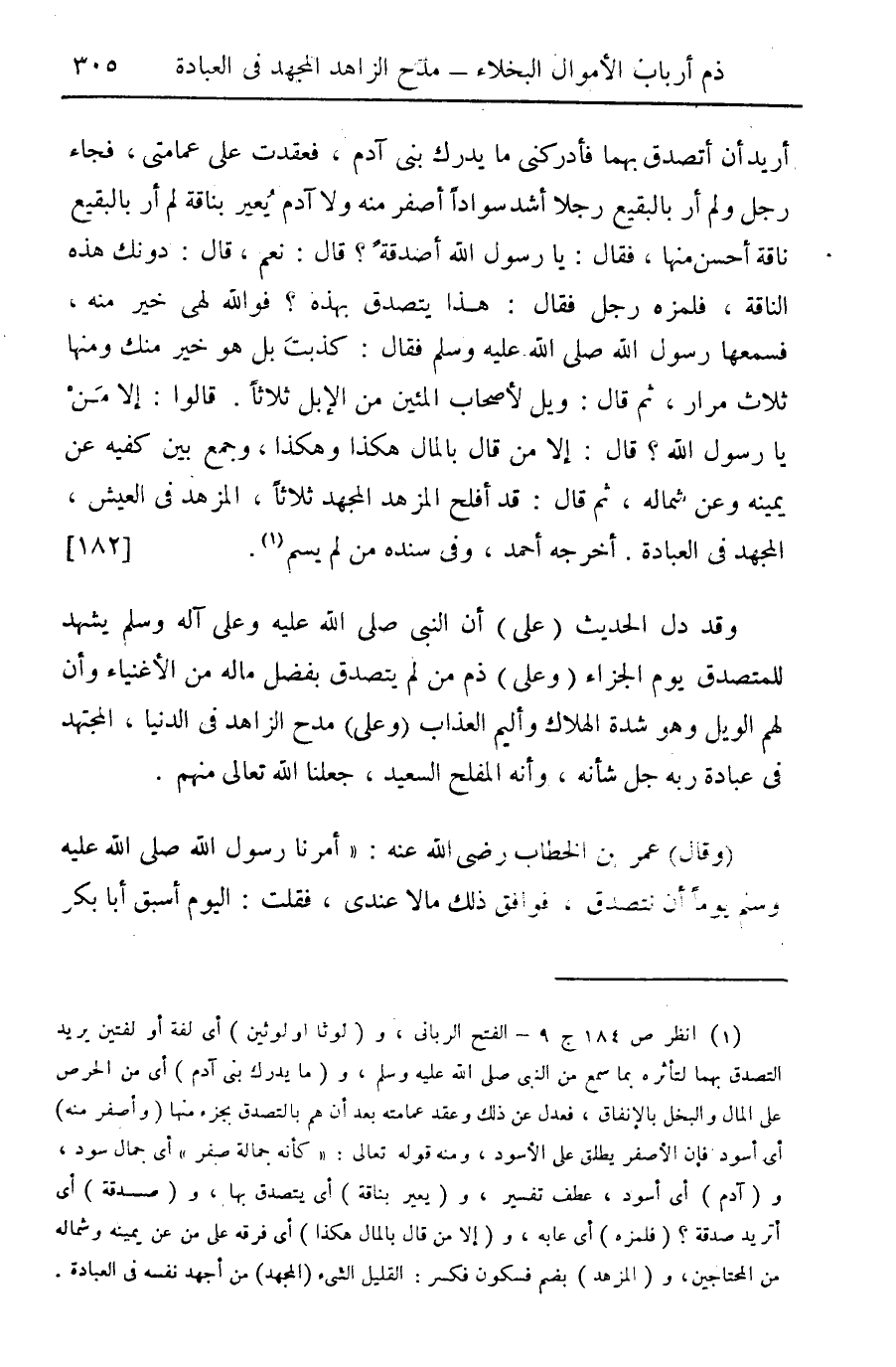أريد أن أتصدق بهما فأدركني ما يدرك بني آدم، فعقدت على عمامتي، فجاء رجل ولم ار بالبقيع رجلا أشد سوادا أصفر منه ولا آدم يعير بناقة لم أر بالبقيع ناقة أحسن منها، فقال: يا رسول الله أصدقة؟ قال: نعم، قال: دونك هذه الناقة، فلمزه رجل فقال: هذا يتصدق بهذه؟ فوالله لهي خير منه، فسمعها رسول اله صلى الله عليه وسلم فقال: كذبت بل هو خير منك ومنها ثلاث مرار، ثم قال: ويل لأصحاب المئين من الغبل ثلاثا. قالوا: إلا من يا رسول الله؟ قال: إلا من قال بالمال هكذا وهكذا، وجمع بين كفيه عن يمينه وعن شمالهن ثم قال: قد أفلح المزهد المجهد ثلاثا، المزهد في العيش، المجهد في العبادة. أخرجه أحمد، وفي سنده من لم يسم (¬1). {182}