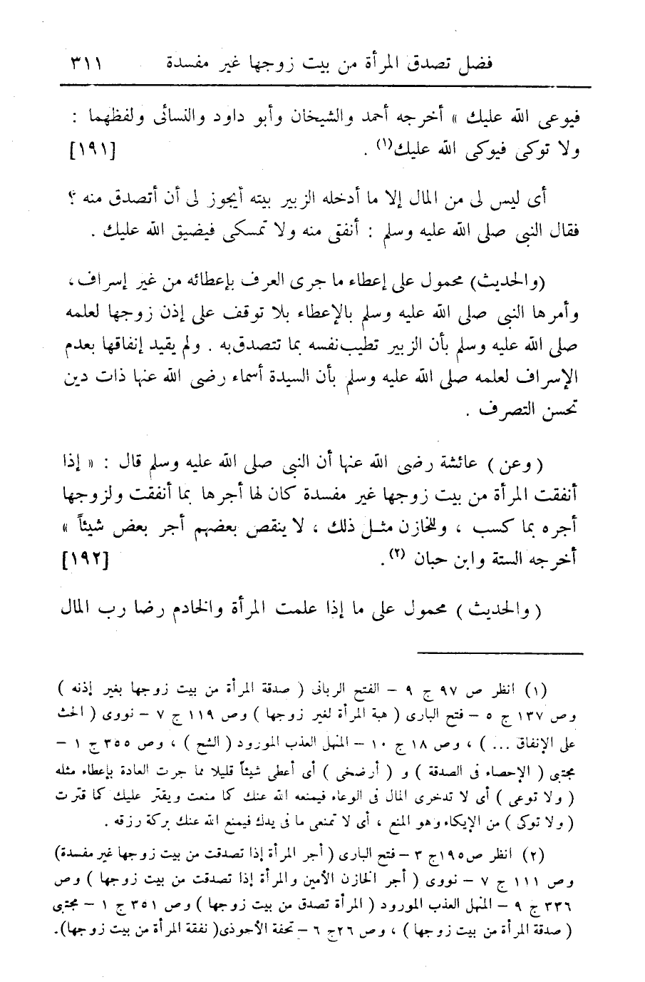 (¬2) انظر ص 195 ج 3 - فتح الباري (أجر المرأة إذا تصدقت من بيت زوجها غير مفسدة) وص 111 ج 7 - نووي (أجر الخازن الأمين والمرأة إذا تصدقت من بيت زوجها) وص 336 ج 9 - المنهل العذب المورود (المرأة تصدق من بيت زوجها) وص 351 ج 1 - مجتبي (صدقة المرأة من بيت زوجها)، وص 26 ج 6 - تحفة الأحوذي (نفقة المرأة من بيت زوجها).