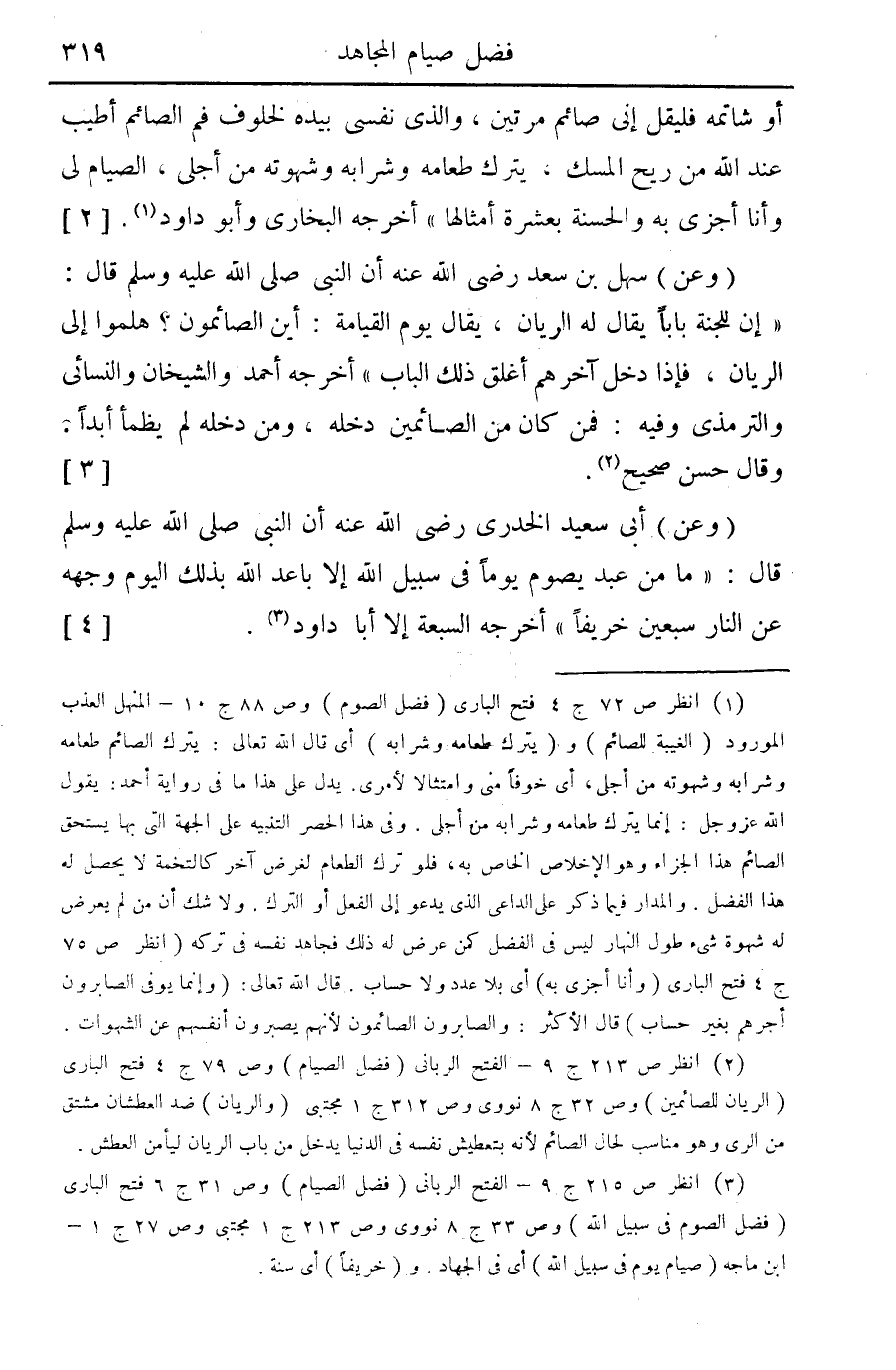 (¬2) انظر ص 213 ج 9 - الفتح الرباني (فضل الصيام) وص 79 ج 4 فتح الباري (الريان للصائمين) وص 32 ج 8 نووي وص 312 ج 1 مجتبي (والريان) ضد العطشان مشتق من الري وهو مناسب لحال الصائم لأنه بتعطيش نفسه في الدنيا يدخل من باب الريان ليأمن العطش.