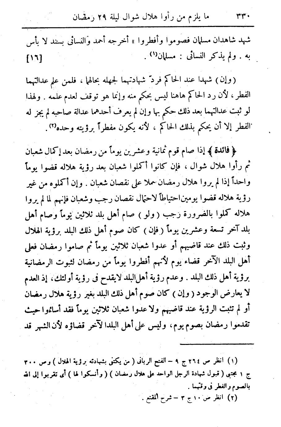شهد شاهدان مسلمان فصوموا وأفطروا" أخرجه احمد والنسائي بسند لا بأس به. ولم يذكر النسائي: مسلمان (¬1) {16}
