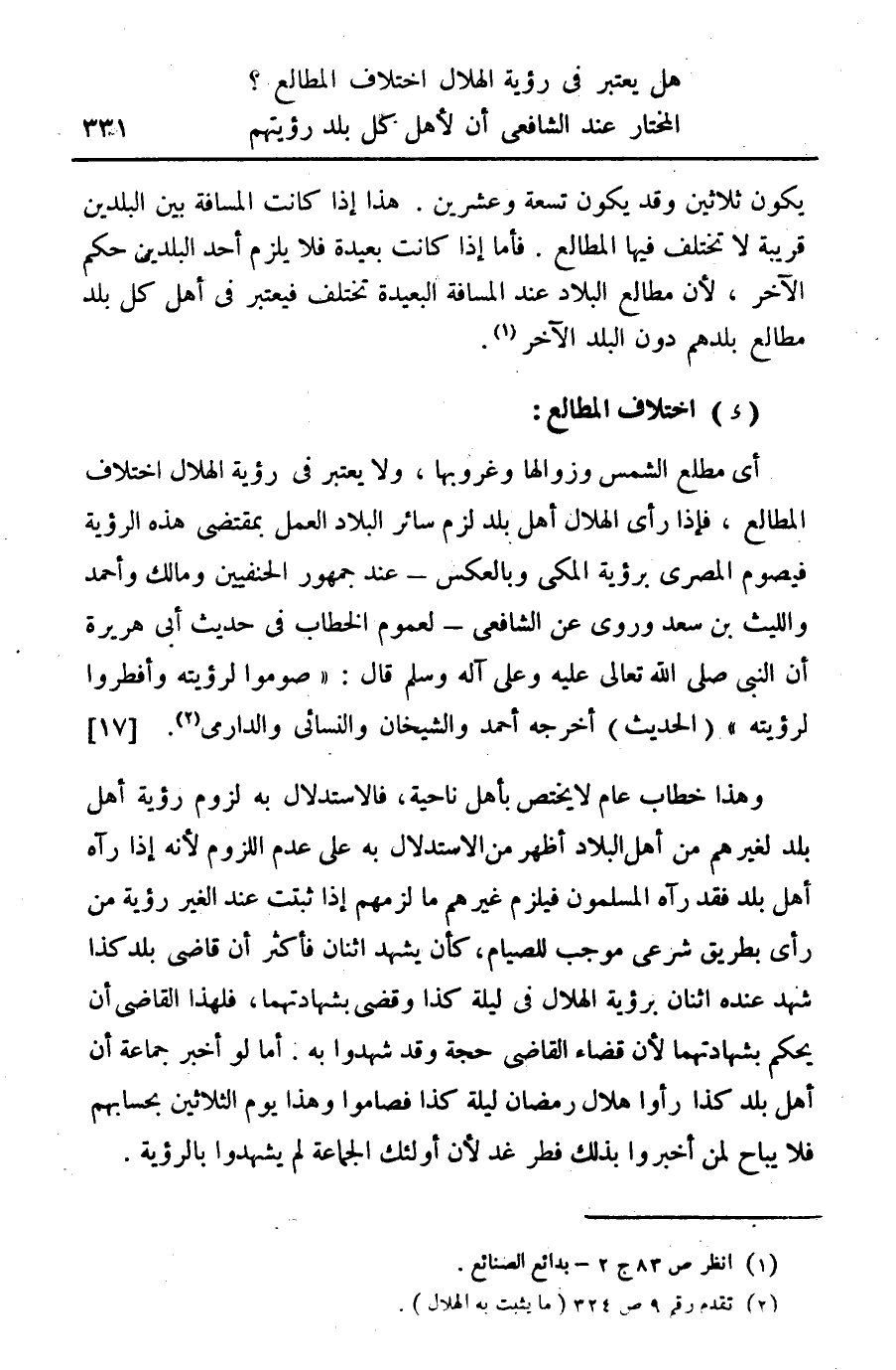 (د) اختلاف المطالع: أي مطلع الشمس وزوالها وغروبها: ولا يعتبر في رؤية الهلال اختلاف المطالع، فإذا رأى الهلال أهل بلد لزم سائر البلاد العمل بمقتضى هذه الرؤية فيصوم المصري برؤية المكي وبالعكس- عند جمهور الحنفيين ومالك وأحمد والليث بن سعد وروي عن الشافعي- لعموم الخطاب في حدث أبي هريرة أن النبي صلى الله تعالى عليه وعلى آله وسلم قال "صوموا لرؤيته وأفطروا لرؤيته" (الحديث) أخرجه أحمد والشيخان والنسائي والدارمي (¬2) {17}