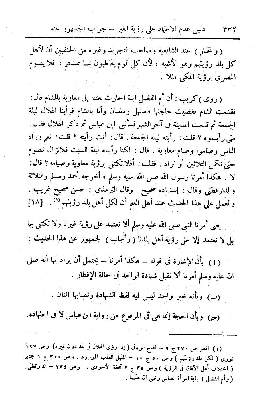 (¬1) انظر ص 270 ج 9 - الفتح الرباني (إذا رؤى الهلال في بلد دون غيره) وص 197 نووي (لكل بلد رؤيتهم) وص 50 ج 10 - المنهل العذب المورود. وص 300 ج 1 مجتبي (اختلاف أهل الآفاق في الرؤية) وص 35 ج 3 تحفة الأحوذي. وص 234 - الدارقطني (وأم الفضل) لبابة امرأة العباس رضي الله عنهما.