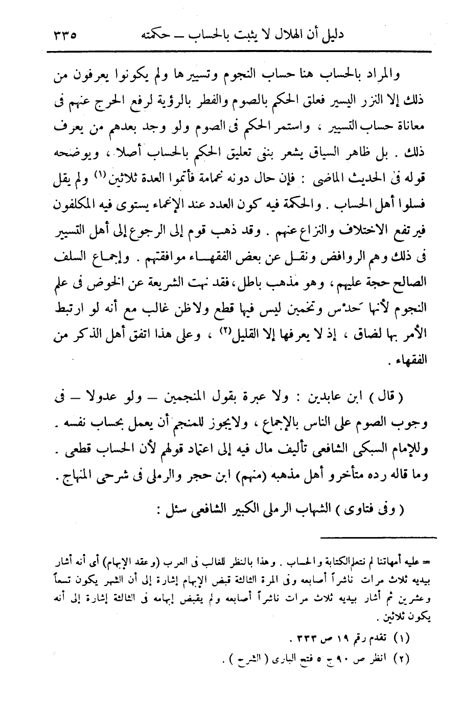 (قال) ابن عابدين: ولا عبرة بقول المنجمين- ولو عدولاً- في وجوب الصوم على الناس بالإجماع ولا يجوز للمنجم أن يعمل بحساب نفسه. وللإمام السبكي الشافعي تأليف مال فيه إلى اعتماد قولهم لأن الحساب قطعي. وما قاله رده متأخرو أهل مذهبه (منهم) ابن حجر والرملي في شرحي المنهاج (وفي فتاوي) الشهاب الرملي الكبير الشافعي سئل: