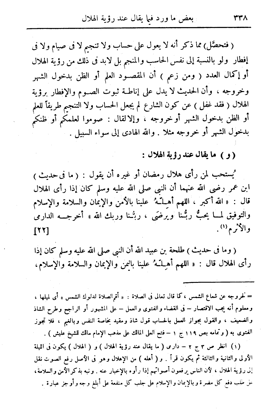 (ز) ما يقال عند رؤية الهلال: يستحب لمن رأى هلال رمضان أو غيره أن يقول: (ما في حديث) ابن عمر رضي الله عنهما أن النبي صلى الله عليه وسلم كان إذا رأى الهلال قال: "الله اكبر أهله علينا بالأمن والإيمان والسلامة والإسلام والتوفيق لما يحب ربنا ويرضى، ربنا وربك الله" أخرجه الدارمي والأثرم (¬1) {22}