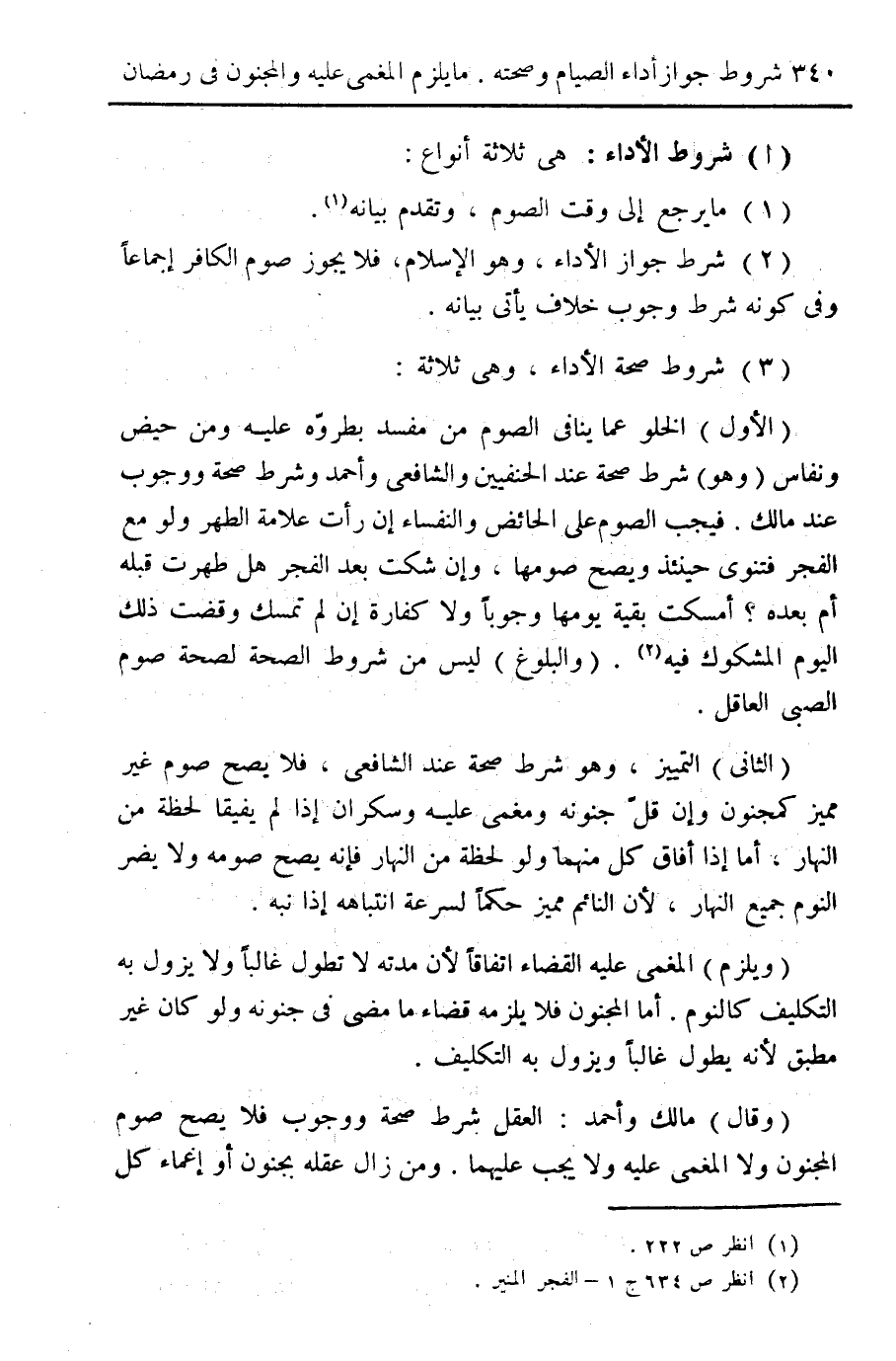(3) شروط صحة الأداء، وهي ثلاثة: (الأول) الخلو عما ينافي الصوم من مفسد بطروه عليه ومن حيض ونفاس (وهو) شرط صحة عند الحنفيين والشافعي وأحمد وشرط صحة ووجوب عند مالك. فيجب الصوم على الحائض والنفساء إن رأت علامة الطهر ولو مع الفجر فتنوي حينئذ ويصح صومها، وإن شكت بعد الفجر هل طهرت قبله أم بعده؟ أمسكت بقية يومها وجوباً ولا كفارة إن لم تمسك وقضت ذلك اليوم المشكوك فيه (¬2) (والبلوغ) ليس من شروط الصحة لصحة صوم الصبي العاقل.
