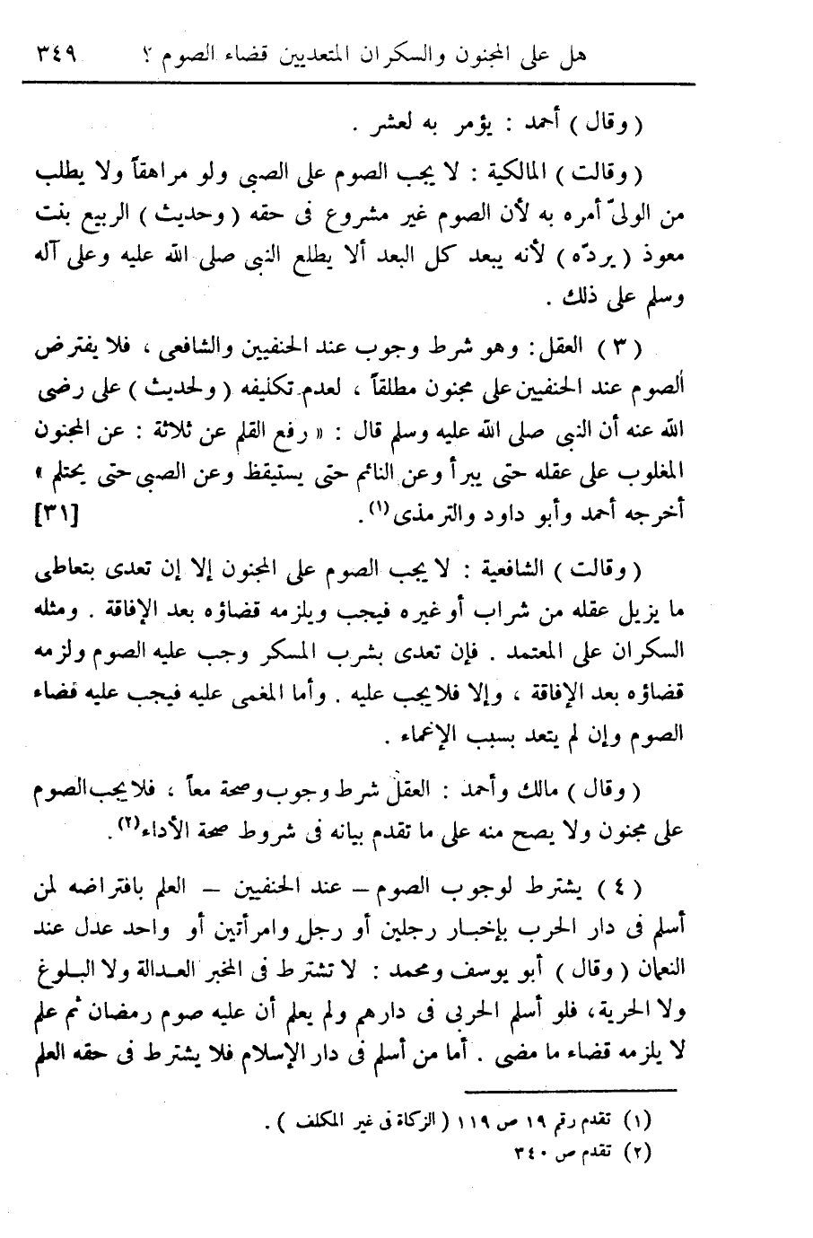 ... (3) العقل: وهو شرط وجوب عند الحنفيين والشافعي. فلا يفترض الصوم عند الحنفيين على مجنون مطلقاً، لعدم تكليفه (ولحديث) علي رضي الله عنه أن النبي صلى الله عليه وسلم قال: "رفع القلم عن ثلاثة: عن المجنون المغلوب على عقله حتى يبرأ وعن النائم حتى يستيقظ وعن الصبي حتى يحتلم" أخرجه أحمد وأبو داود