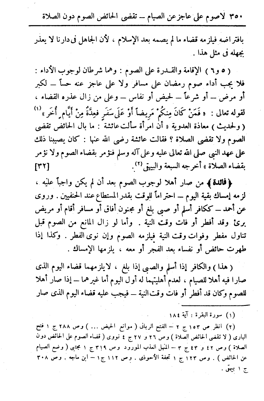 (5 و 6) الإقامة والقدرة على الصوم: وهما شرطان لوجوب الأداء: فلا يجب أداء صوم رمضان على مسافر ولا على عاجز عنه حسا- لكبر أو مرض- أو شرعاً- لحيض أو نفاس- وعلى من زال عذره القضاء، لقوله تعالى "فمن كان منكم مريضاً أو على سفرٍ فعدة من أيامٍ أخر (¬1) " (ولحديث) معاذة العدوية "أن امرأة سألت عائشة: ما بال الحائض تقضي الصوم ولا تقضي الصلاة؟ فقالت عائشة رضي الله عنها: كان يصيبنا ذلك على عهد النبي صلى الله تعالى عليه وعلى آله وسلم فنؤمر بقضاء الصوم ولا نؤمر بقضاء الصلاة" أخرجه السبعة والبيهقي (¬2) {32}