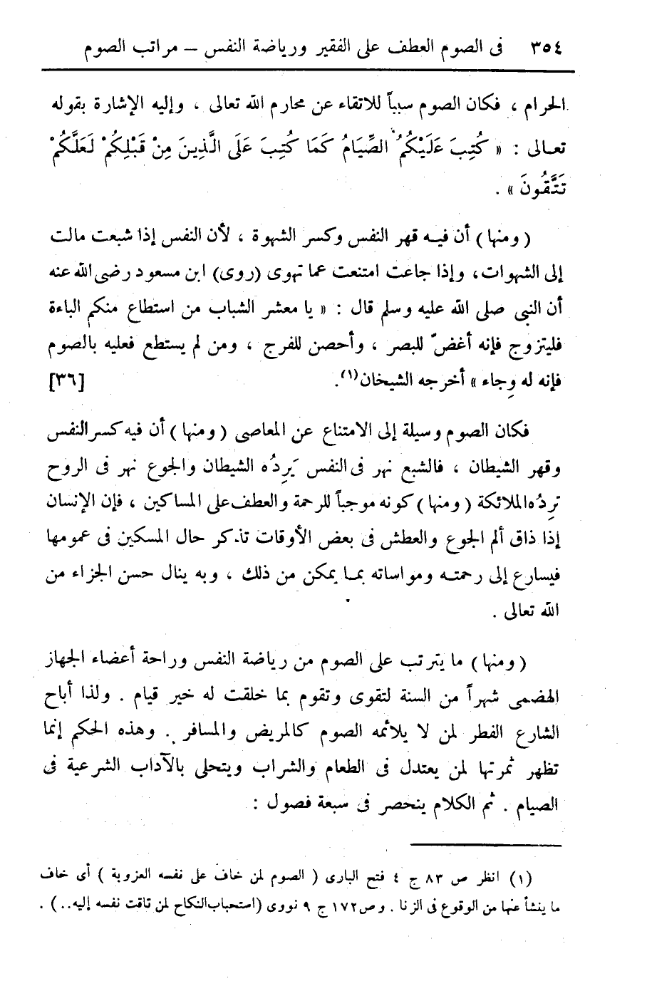 (ومنها) ما يترتب على الصوم من رياضة النفس وراحة أعضاء الجهاز الهضمي شهراً من السنة لتقوى وتقوم بما خلقت له خير قيام. ولذا أباح الشارع الفطر لمن لا يلائمه الصوم كالمريض والمسافر. وهذه الحكم إنما تظهر ثمرتها لمن يعتدل في الطعام والشراب ويتحلى بالآداب الشرعية في الصيام. ثم الكلام ينحصر في سبعة فصول.
