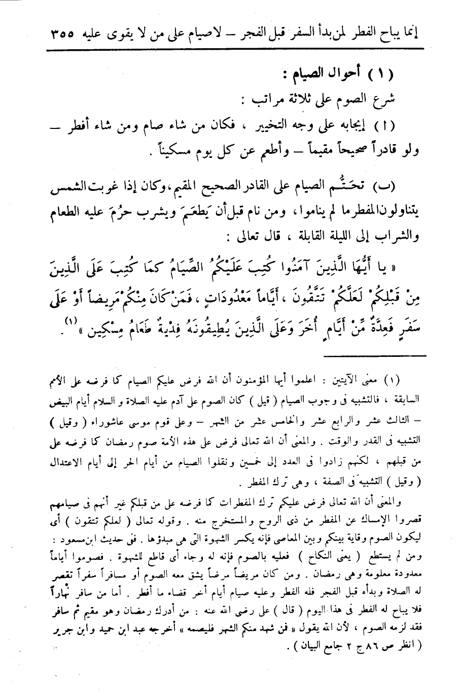 (1) أحوال الصيام: شرع الصوم على ثلاثة مراتب (أ) إيجابه على وجه التخيير، فكان من شاء صام ومن شاء أفطر- ولو قادراً صحيحاً مقيماً- وأطعم عن كل يوم مسكيناً.