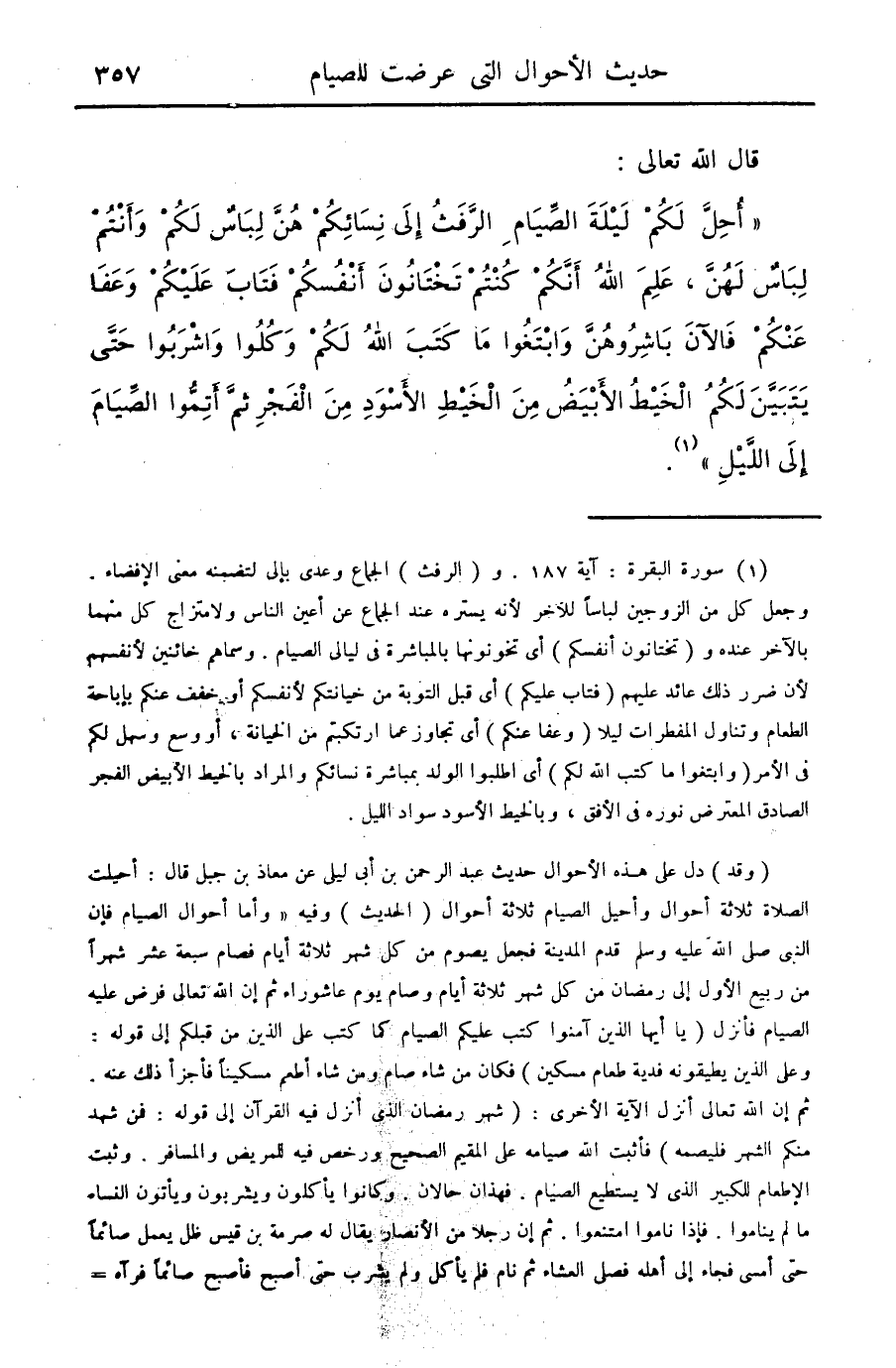 (¬1) سورة البقرة: آية 187. و (الرفث) الجماع وعدي بإلى لتضمنه معنى الإفضاء. وجعل كل من الزوجين لباساً للآخر لأنه يستره عند الجماع عن أعين الناس ولامتزاج كل منهما بالآخر عنده و (تختانون أنفسكم) أي تخونونها بالمباشرة في ليالي الصيام. وسماهم خائنين لأنفسهم لأن ضرر ذلك عائد عليهم (فتاب عليكم) أي قبل التوبة من خيانتكم لأنفسكم أو خفف عنكم بإباحة الطعام وتناول المفطرات ليلاً. (وعفا عنكم) أي تجاوز عما ارتكبتم من الخيانة أو وسع وسهل لكم في الأمر (وابتغوا ما كتب الله لكم) أي اطلبوا الولد بمباشرة نسائكم والمراد بالخيط الأبيض الفجر الصادق المعترض نوره في الأفق وبالخيط الأسود سواد الليل (وقد) دل على هذه الأحوال حديث عبد الرحمن ابن أبي ليلى عن معاذ بن جبل قال: أحيلت الصلاة ثلاثة أحوال وأحيل الصيام ثلاثة أحوال (الحديث) وفيه "وأما أحوال الصيام فإن النبي صلى الله عليه وسلم قدم المدينة فجعل يصوم من كل شهر ثلاثة أيام فصام سبعة عشر شهراً من ربيع الأول إلى رمضان من كل شهر ثلاثة أيام وصام يوم عاشوراء ثم إن الله تعالى فرض عليه الصيام فأنزل (يأيها الذين آمنوا كتب عليكم الصيام كما كتب على الذين من قبلكم إلى قوله: وعلى الذين يطيقونه فدية طعام مسكين) فكان من شاء صام ومن شاء أطعم مسكيناً فأجزأ ذلك عنه .. ثم إن الله تعالى أنزل الآية الأخرى: (شهر رمضان الذي أنزل فيه القرآن إلى قوله: فمن شهد منكم الشهر فليصمه) فأثبت الله صيامه على المقيم الصحيح ورخص فيه للمريض والمسافر وثبت الإطعام للكبير الذي لا يستطيع الصيام. فهذان حالان. وكانوا يأكلون ويشربون ويأتون النساء ما لم يناموا. فإذا ناموا امتنعوا. ثم إن رجلاً من الأنصار يقال له صرمة بن قبس ظل يعمل صائماً حتى أمسى فجاء إلى أهله فصلى العشاء ثم نام فلم يأكل ولم يشرب حتى أصبح فأصبح نائماً فرآه النبي صلى الله عليه وسلم وقد جهد جهداً شديداً قال "ما لي أراك قد جهدت جهداً شديداً قال: يا رسول الله إني عملت أمس فجئت حين جئت فألقيت نفسي فنمت وأصبحت صائماً وكان عمر قد أصاب من النساء- من جارية أو من حرة- بعد ما نام وأتى النبي صلى الله عليه وسلم فذكر ذلك له فأنزل الله تعالى "أحل لكم ليلة الصيام- الآية" أخرجه احمد وأبو داود والبيهقي وهو مرسل صحيح السند فإن ابن ابي ليلى لم يدرك معاذاً (انظر ص 239 ج 9 - الفتح الرباني- الأحوال التي عرضت للصيام. وص 151 ج 4 - المنهل العذب المورود- كيف الأذان).