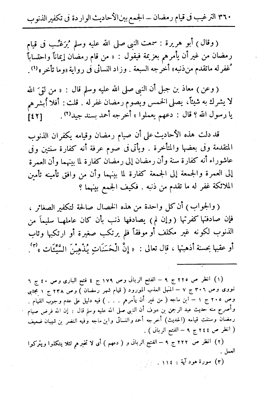 قد دلت هذه الأحاديث على أن صيام رمضان وقيامه يكفر أن الذنوب المتقدمة وفي بعضها والمتأخرة. ويأتي في صوم عرفة أنه كفارة سنتين وفي عاشوراء أنه كفارة سنة وأن رمضان إلى رمضان كفارة لما بينهما وأن العمرة إلى العمرة والجمعة إلى الجمعة كفارة لما بينهما وأن من وافق تأمينه تأمين الملائكة غفر له ما تقدم من ذنبه. فكيف الجمع بينهما؟