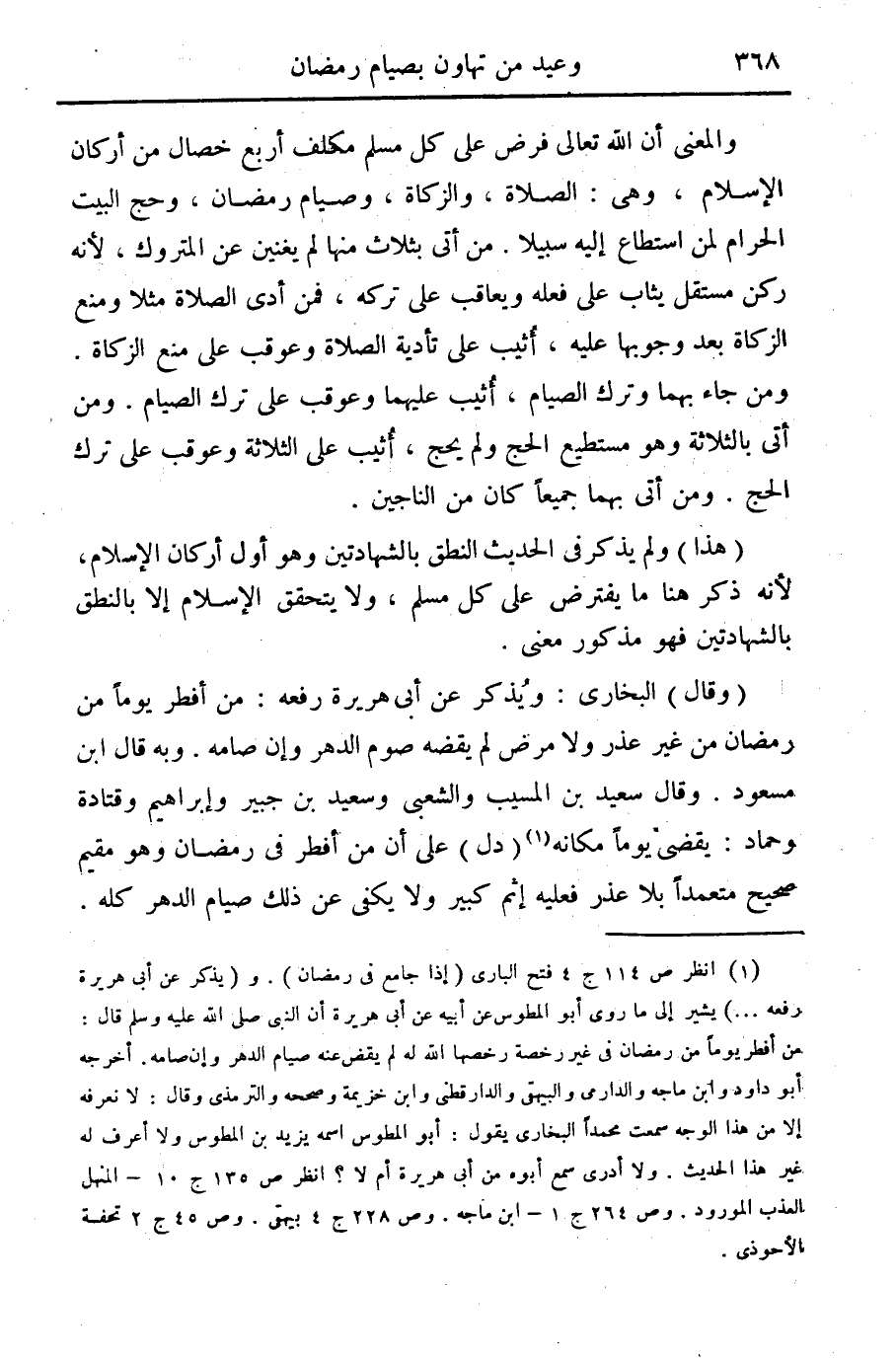 (¬1) انظر ص 114 ج 4 فتح الباري (إذا جامع في رمضان). و (يذكر عن أبي هريرة رفعه .... ) يشير إلى ما روي أبو المطوس عن أبيه عن أبي هريرة أن النبي صلى الله عليه وسلم قال: من أفطر يوماً من رمضان في غير رخصة رخصها الله له لم يقض عنه صيام الدهر وإن صامه. أخرجه أبو داود وابن ماجه والدارمي والبيهقي والدارقطني وابن خزيمة وصححه والترمذي وقال: لا نعرفه إلا من هذا الوجه سمعت محمداً البخاري يقول: أبو المطوس اسمه يزيد بن المطوس ولا أعرف له غير هذا الحديث. ولا أدري سمع أبوه من أبي هريرة أم لا؟ انظر ص 135 ج 10 - المنهل العذب المورود. وص 264 ج 1 - ابن ماجه. وص 228 ج 4 بيهقي. وص 45 ج 2 تحفة الأحوذي.