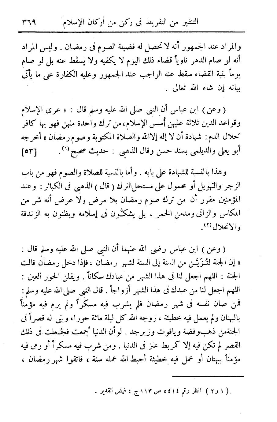 وهذا بالنسبة للشهادة على بابه. وأما بالنسبة للصلاة والصوم فهو من باب الزجر والتهويل أو محمول على مستحل الترك (قال) الذهبي في الكبائر وعند المؤمنين مقرر أن من ترك صوم رمضان بلا مرض ولا عرض أنه شر من المكاس والزاني ومدمن الخمر. بل يشكون في إسلامه ويظنون به الزندقة والانحلال (¬2).