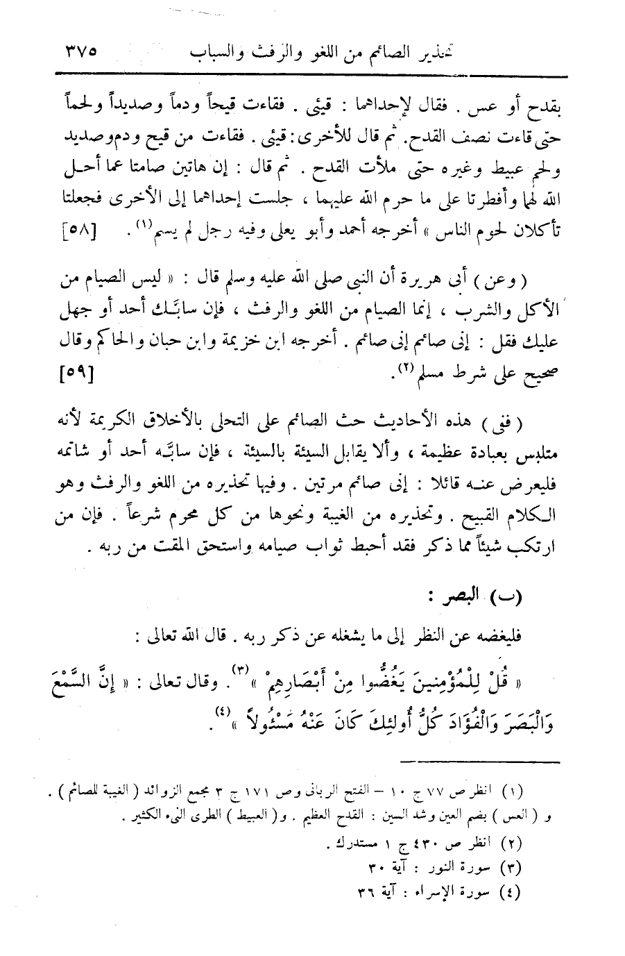 (2) البصر: فليغضه عن النظر إلى ما يشغله عن ذكر ربه قال الله تعالى: "قل للمؤمنين يغضوا من أبصارهم (¬3) " وقال تعالى: (إن السمع والبصر والفؤاد كل أولئك كان عنه مسئولاً (¬4) "