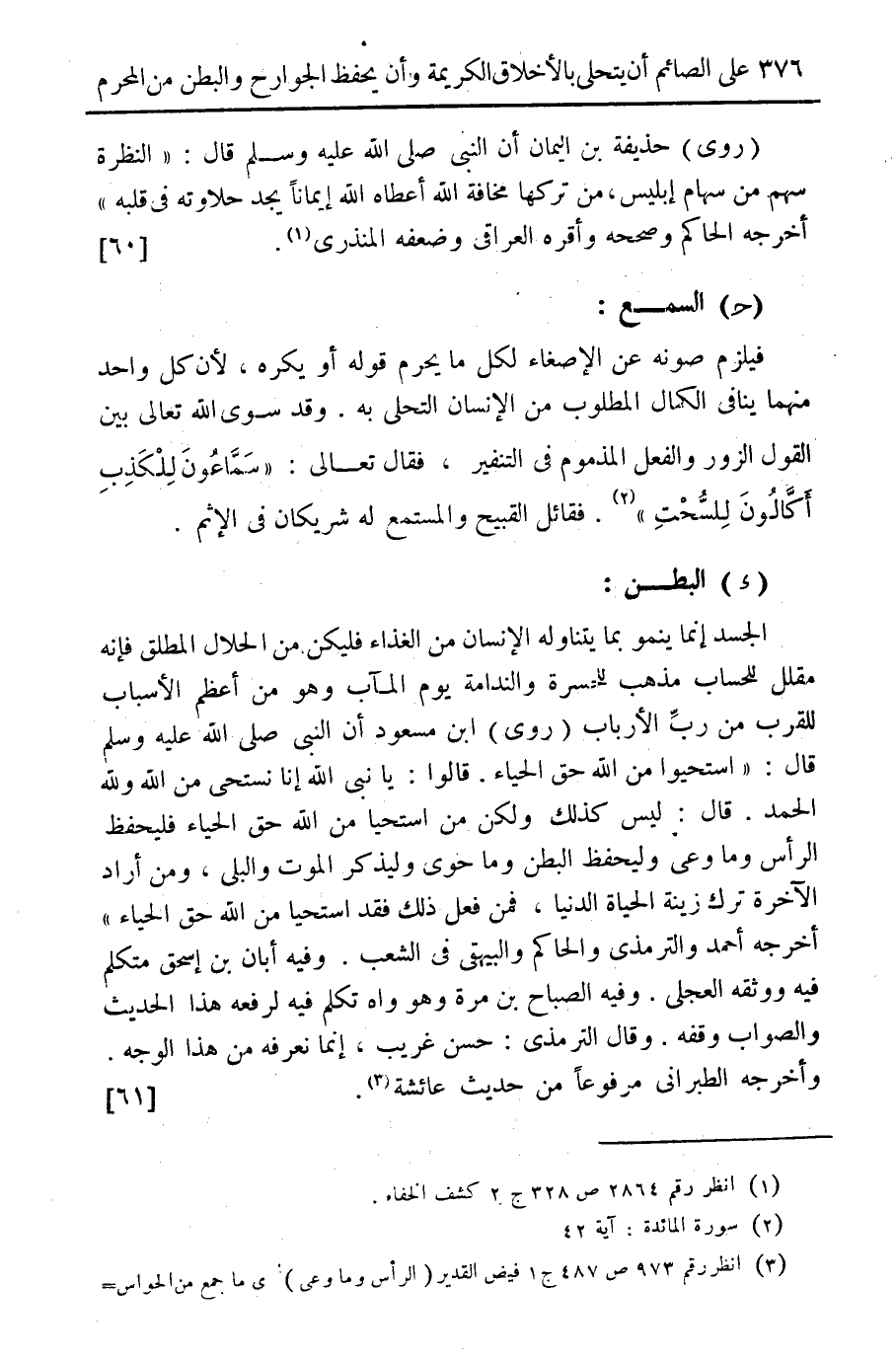 ... (3) السمع: فيلزم صونه عن الإصغاء لكل ما يحرم قوله أو يكره لأن كل واحد منهما ينافي الكمال المطلوب من الإنسان التحلي به. وقد سوى الله تعالى بين القول الزور والفعل المذموم في التنقير، فقال الله تعالى: "سماعون للكذب أكالون للسحت" فقائل القبيح والمستمع له شريكان في الإثم.