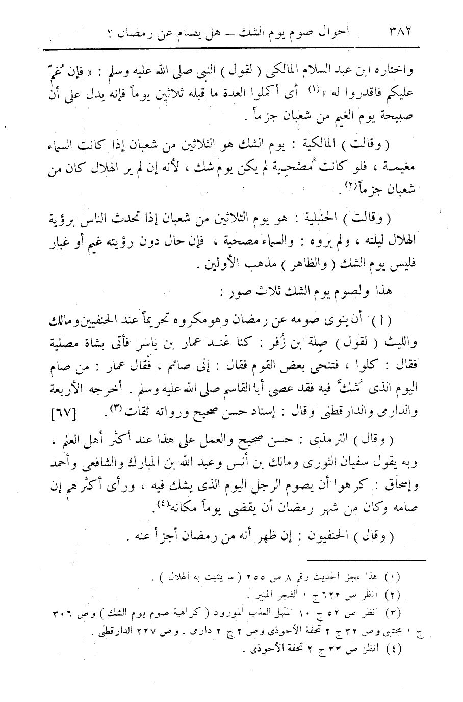 ... (أ) أن ينوي صومه عن رمضان وهو مكروه تحريماً عند الحنفيين ومالك والليث (لقول) صلة بن زفر: كنا عند عمار بن ياسر فأتى بشاة مضية فقال: كلوا، فتنحى بعض القوم فقال: إني صائم، فقال عمار: من صام اليوم الذي شك فيه فقد عصى أبا القاسم صلى الله عليه وسلم أخرجه الأربعة والدارمي والدارقطني وقال: إسناد حسن صحيح ورواته ثقات (¬3) {67}