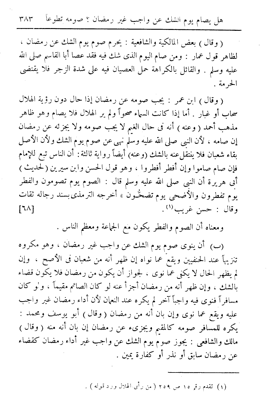 (وقال) بعض المالكية والشافعية يحرم صومه يوم الشك عن رمضان، لظاهر قول عمار: ومن صام اليوم الذي شك فيه فقد عصا أبا القاسم صلى الله عليه وسلم. والقائل بالكراهة حمل العصيان فيه على شدة الزجر فلا يقتضي الحرمة (وقال) ابن عمر: يجب صومه عن رمضان إذا حال دون رؤية الهلال سحاب أو غبار. أما إذا كانت السماء سحواً ولم ير الهلال فلا يصام وهو ظاهر مذهب أحمد (وعنه) أنه في حال الغيم لا يجب صومه ولا يجزئه عن رمضان إن صامه، لأن النبي صلى الله عليه وسلم نهى عن صوم يوم الشك ولأن الأصل بقاء شعبان فلا ينتقل عنه بالشك (وعنه) أيضاً رواية ثالثة أن الناس تبع للإمام فإن صاموا وإن أفطر أفطروا، وهو قول الحسن وابن سيرين (لحديث) أبي هريرة أن النبي صلى الله عليه وسلم قال: الصوم يوم تصومون والفطر يوم تفطرون والأضحى يوم تضحون" أخرجه الترمذي بسند رجاله ثقات وقال: حسن غريب (¬1) {68}