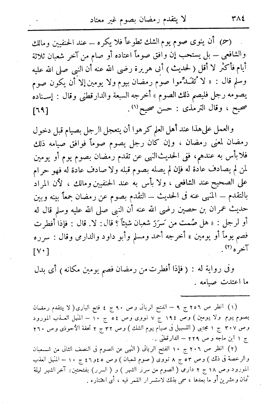 (¬1) انظر ص 256 ج 9 - الفتح الرباني وص 90 ج 4 فتح الباري (لا يتقدم رمضان بصوم يوم ولا يومين) وص 194 ج نووي وص 54 ج 10 - المنهل العذب المورود وص 307 ج 1 مجتبي (التسهيل في صيام يوم الشك) وص 33 ج 2 تحفة الأحوذي وص 260 ج 1 - ابن ماجه وص 229 - الدارقطني.