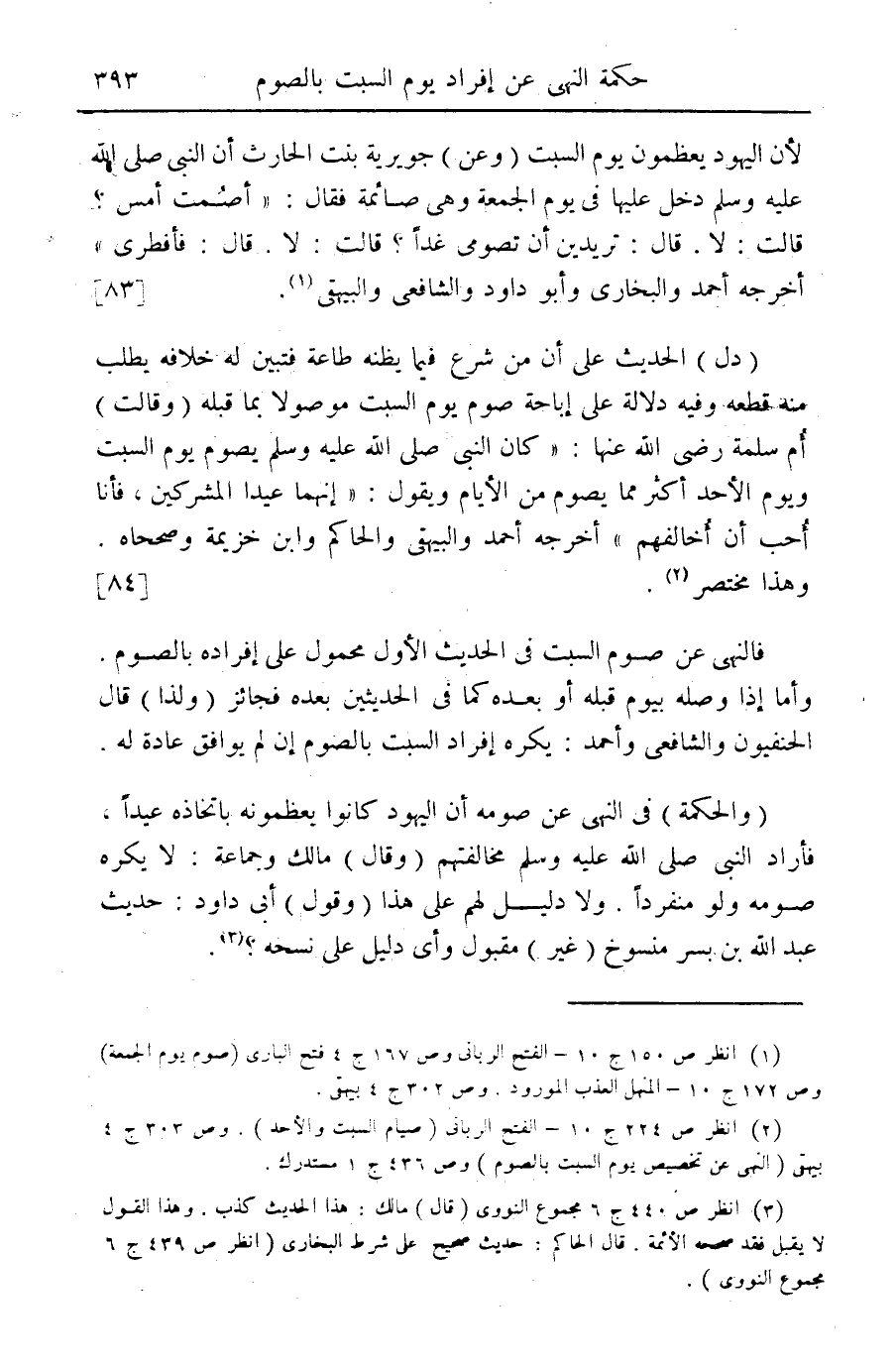 (¬2) انظر ص 224 ج 10 - الفتح الرباني (صيام السبت والأحد). وص 303 ج 4 بيهقي (النهي عن تخصيص يوم السبت بالصوم) وص 436 ج 1 مستدرك.