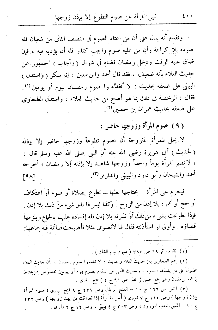 (9) صوم المرأة وزوجها حاضر: لا يحل للمرأة المتزوجة أن تصوم تطوعاً وزوجها حاضر إلا بإذنه (لحديث) أبي هريرة رضي الله عنه أن النبي صلى الله عليه وسلم قال: "لا تصم المرأة يوماً واحداً وزوجها شاهد إلا بإذنه إلا رمضان" أخرجه أحمد والشيخان وأبو داود والبيهقي والدارمي (¬3) {98}
