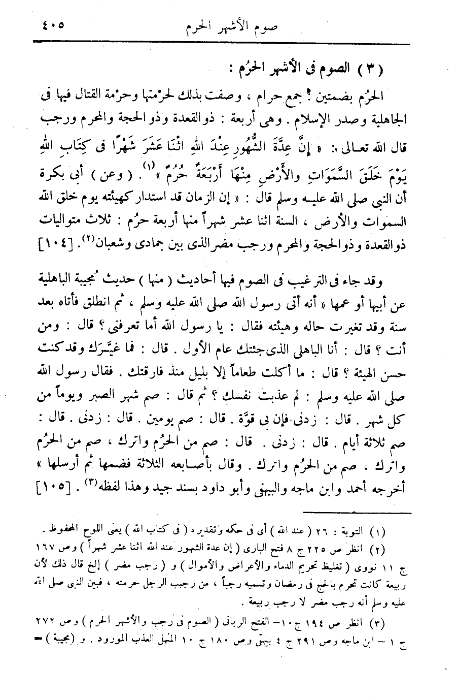 (3) الصوم في الأشهر الحرم: الحرم بضمتين جمع حرام وصفت بذلك لحرمتها وحرمة القتال فيها في الجاهلية وصدر الإسلام. وهي أربعة ذو القعدة وذو الحجة والمحرم ورجب قال الله تعالى "إن عدة الشهور عند الله اثنا عشر شهراً في كتاب الله يوم خلق السموات والأرض منها أربعة حرم" (¬1). (وعن) أبي بكرة أن النبي صلى الله عليه وسلم قال: "إن الزمان قد استدار كهيئته يوم خلق الله السموات والأرض، السنة اثنا عشر شهراً منها أربعة حرم: ثلاث متواليات ذو القعدة وذو الحجة والمحرم ورجب مضر الذي بين جمادي وشعبان (¬2). {104}