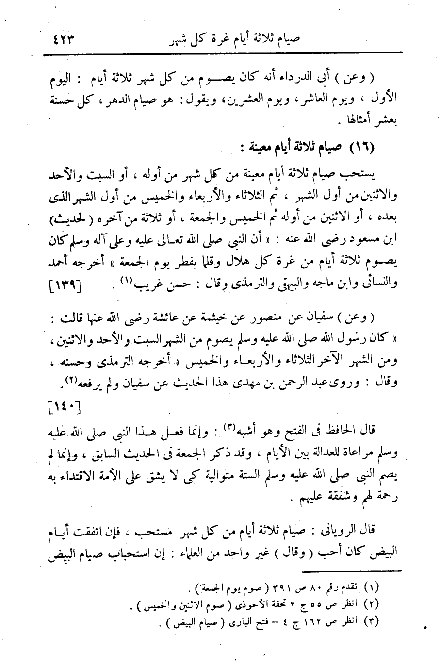 ... (16) صيام ثلاثة أيام معينة: يستحب صيام ثلاثة أيام معينة من كل شهر من أوله، أو السبت والأحد والاثنين من أول الشهر، ثم الثلاثاء والأربعاء والخميس من أول الشهر الذي بعده، أو الاثنين من أوله ثم الخميس والجمعة، أو ثلاثة من آخره (لحديث) ابن مسعود رضي الله عنه: "أن النبي صلى الله تعالى عليه وعلى آله وسلم كان يصوم ثلاثة أيام من غرة كل هلال وقاما يفطر يوم الجمعة" أخرجه أحمد والنسائي وابن ماجه والبيهقي والترمذي وقال: حسن غريب (¬1) {139}