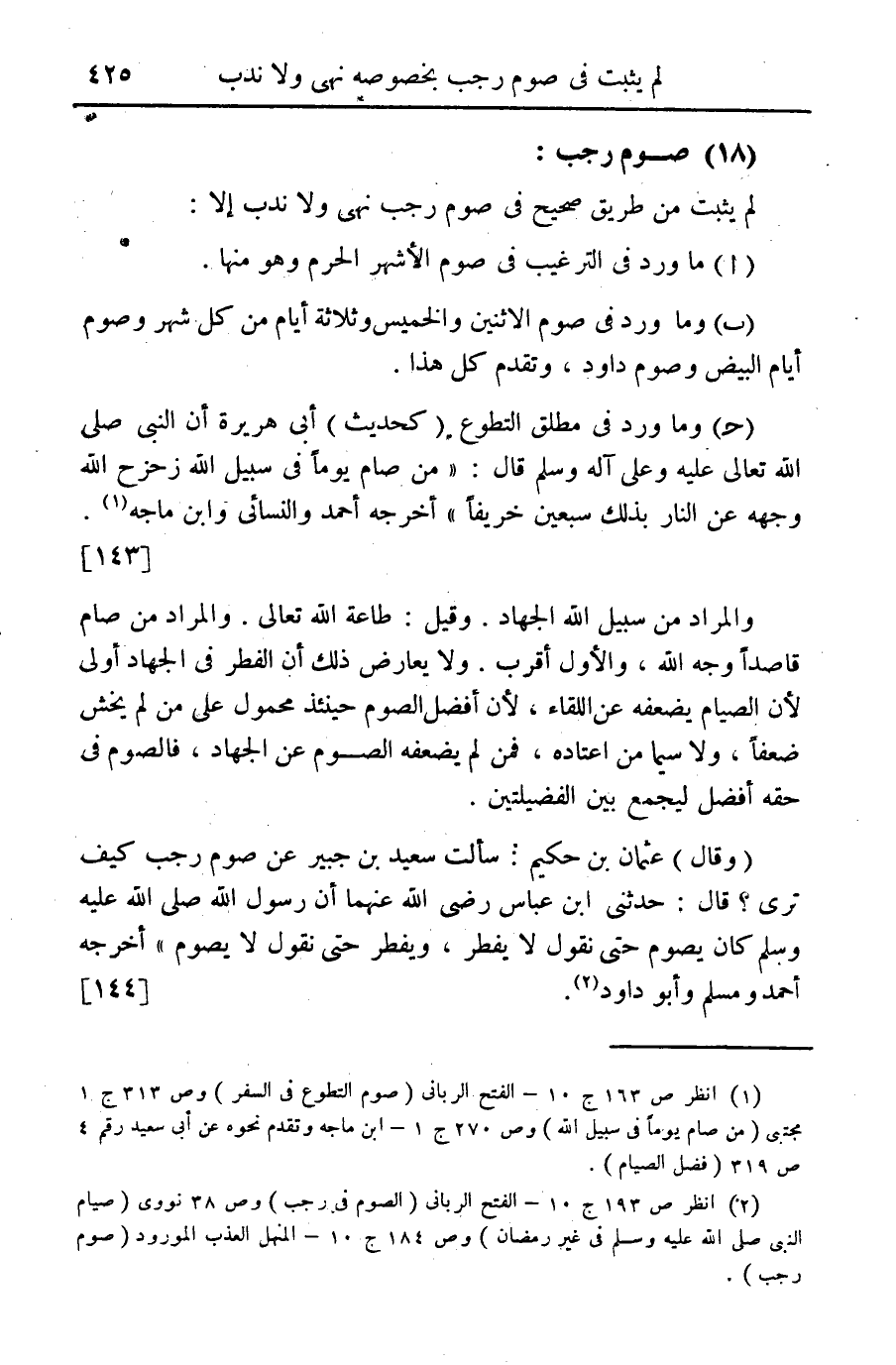 (18) صوم رجب: لم يثبت من طريق صحيح في صوم رجب نهي ولا ندب إلا: (أ) ما ورد في الترغيب في صوم الأشهر الحرم وهو منها. (ب) وما ورد في صوم الاثنين والخميس وثلاثة أيام من كل شهر وصوم أيام البيض وصوم داود، وتقدم كل هذا. (ج) وما ورد في مطلق التطوع (كحديث) أبي هريرة أن النبي صلى الله عليه وعلى آله وسلم قال: "من صام يوماً في سبيل الله زحزح الله وجهه عن النار بذلك سبعين خريفاً" أخرجه احمد والنسائي وابن ماجه (¬1) {143}