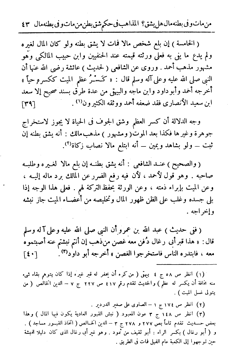 (الخامسة) إن بلع شخص مالا فمات لا يشق بطنه ولو كان المال لغيره ولم يدع ما يفي به فعلى ورثته قيمته عند الحنفيين وابن حبيب المالكي وهو مشهور مذهب أحمد. وروى عن الشافعي (الحديث) عائشة رضي الله عنها أن النبي صلى الله عليه وعلى آله وسلم قال: "كسر عظم الميت ككسره حيا" أخرجه أحمد وأبو داود وابن ماجه والبيهقي من عدة طرق بسند صحيح إلا سعد ابن سعيد الأنصاري فقد ضعفه أحمد ووثقه الكثيرون (¬1). {39}