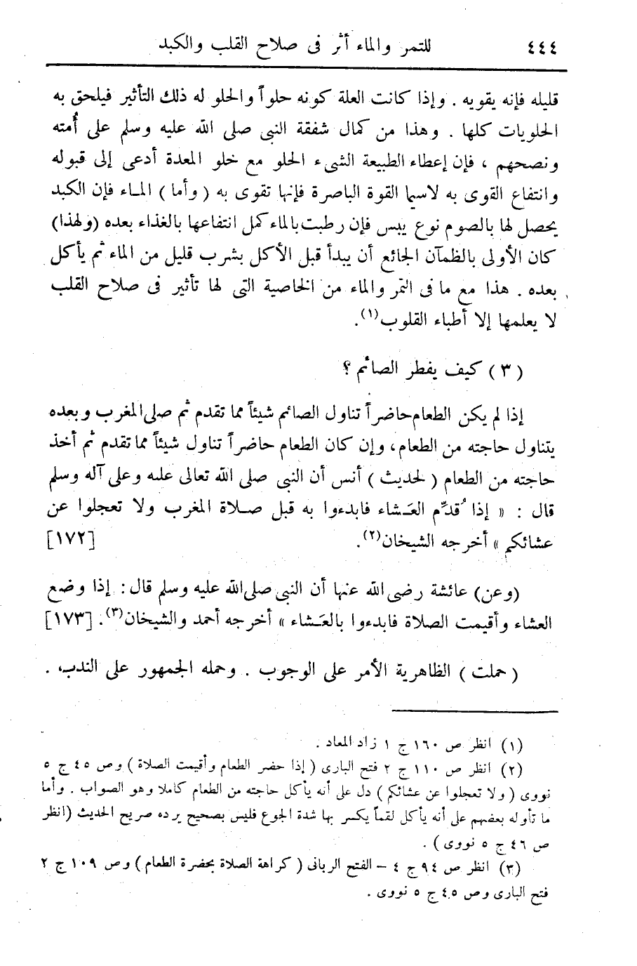 (3) كيف يفطر الصائم؟ - إذا لم يكن الطعام حاضراً تناول الصائم شيئاً مما تقدم ثم صلى المغرب وبعده يتناول حاجته من الطعام وإن كان الطعام حاضراً تناول شيئاً مما تقدم ثم أخذ حاجته من الطعام (لحديث) أنس أن النبي صلى الله تعالى عليه وعلى آله وسلم قال: "إذا قدم العشاء فابدءوا به قبل صلاة المغرب ولا تعجلوا عن عشائكم" أخرجه الشيخان (¬2) {172}