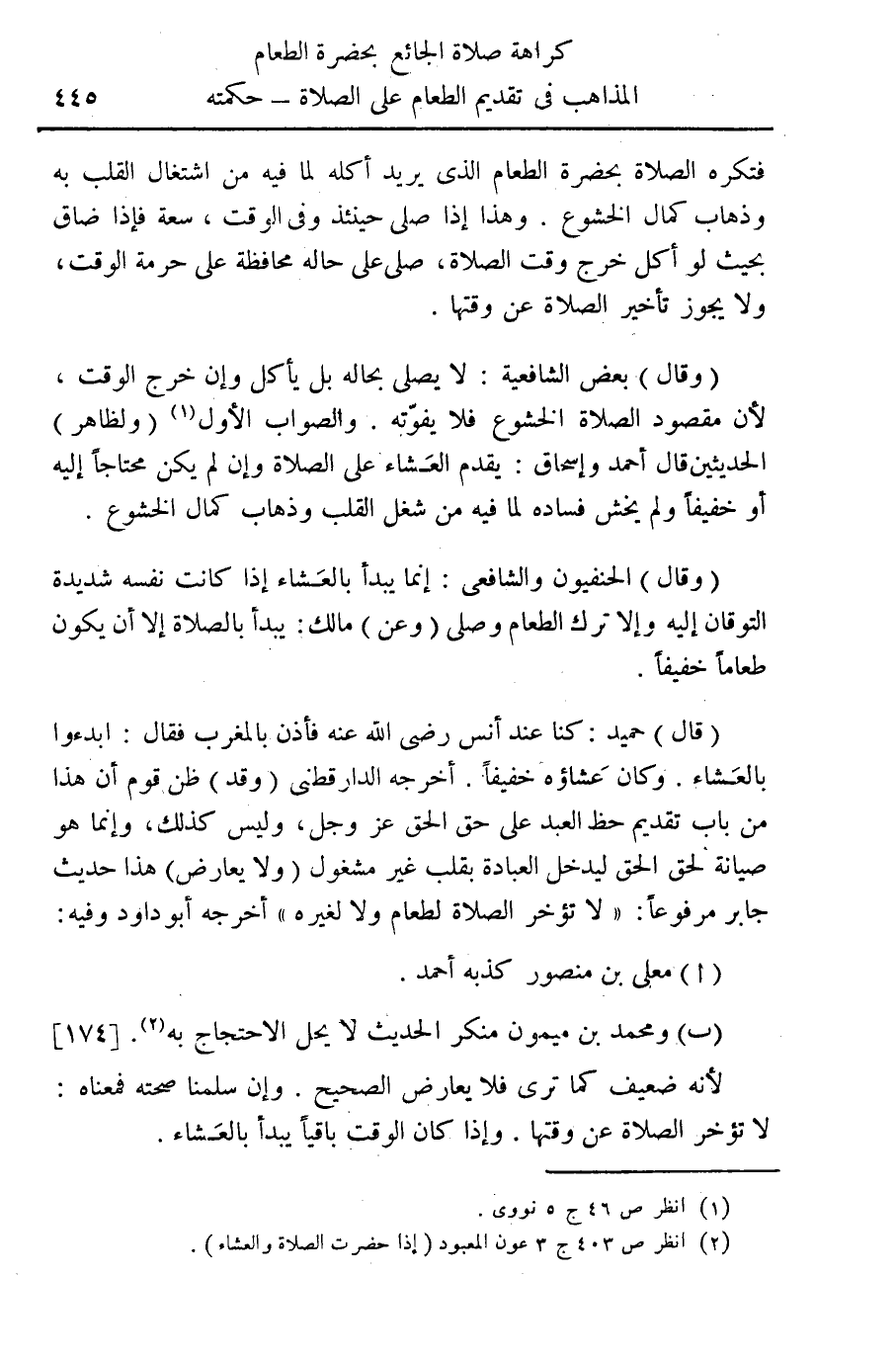 فتكره الصلاة بحضرة الطعام الذي يريد أكله لما فيه من اشتغال القلب به وذهاب كمال الخشوع. وهذا إذا صلى حينئذ وفي الوقت سعة فإذا ضاق بحيث لو أكل خرج وقت الصلاة، صلى على حاله محافظة على حرمة لوقت ولا يجوز تأخير الصلاة عن وقتها (وقال) بعض الشافعية: لا يصلي بحاله بل يأكل وإن خرج الوقت، لأن مقصود الصلاة الخشوع فلا يفوته. والصواب الأول (¬1) (ولظاهر) الحديثين قال أحمد وإسحاق: يقدم العشاء على الصلاة وإن لم يكن محتاجا إليه أو خفيفاً ولم يخش فساده لما فيه من شغل القلب وذهاب كمال الخشوع (وقال) الحنفيون والشافعي: إنما يبدأ بالعشاء إذا كانت نفسه شديدة التوقان إليه وإلا ترك الطعام وصلى (وعن) مالك: يبدأ بالصلاة إلا أن يكون طعاماً خفيفاً (قال) حميد: كنا عند أنس رضي اله عنه فأذن بالمغرب فقال: أبدءوا بالعشاء. وكان عشاؤه خفيفاً. أخرجه الدارقطني (وقد) ظن قوم أن هذا من باب تقديم حظ العبد على حق الحق عز وجل وليس كذلك. وإنما هو صيانة لحق الحق ليدخل العبادة بقلب غير مشغول (ولا يعارض) هذا حديث جابر مرفوعاً "لا تؤخر الصلاة لطعام ولا لغيره" أخرجه أبو داود وفيه (أ) معلي بن منصور كذبه أحمد. (ب) ومحمد بن ميمون منكر الحديث لا يحل الاحتجاج به (¬2) {174}