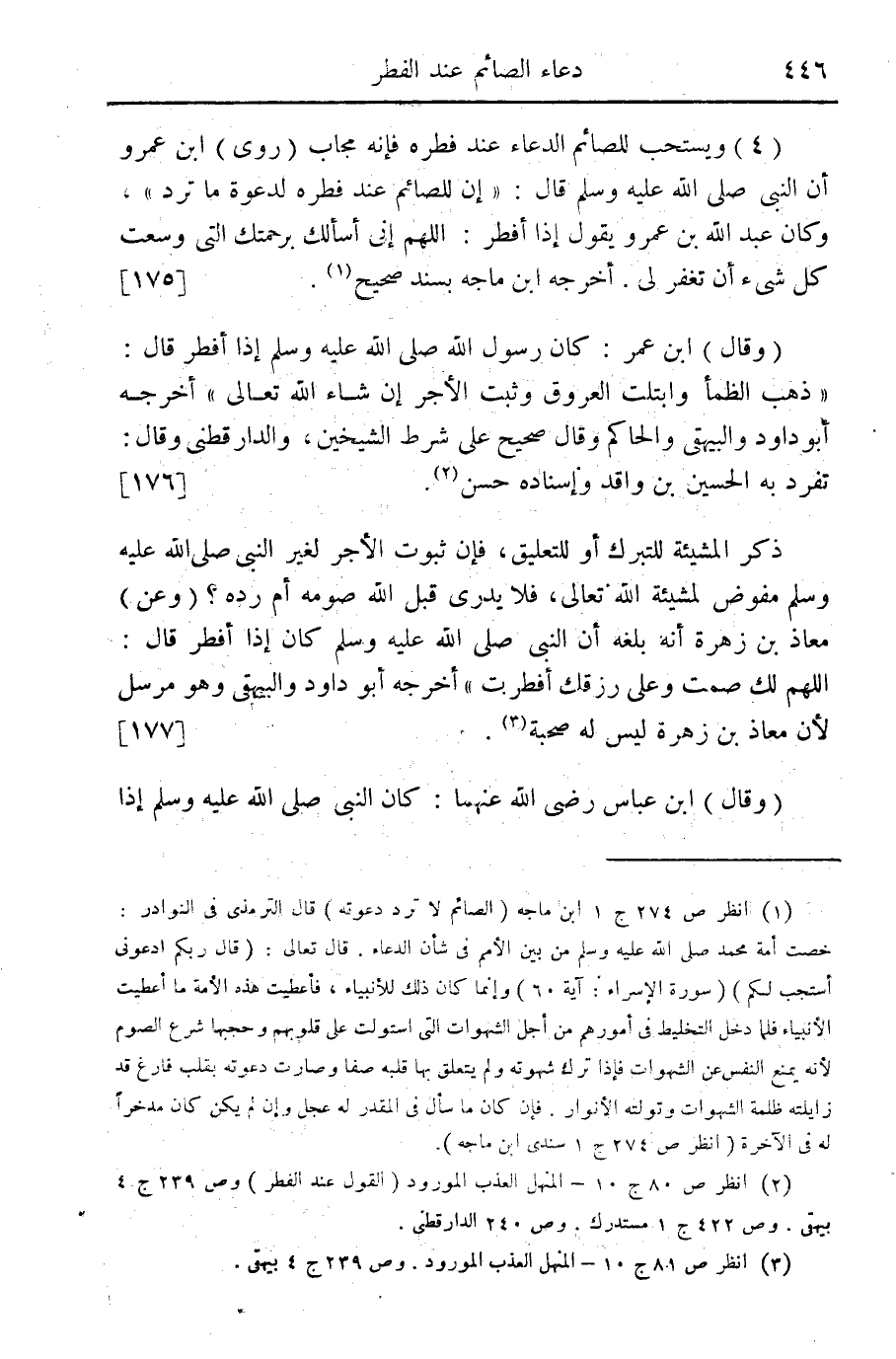 ... (وقال) ابن عمر: كان رسول الله صلى الله عليه وسلم إذا أفطر قال "دهب الظمأ وابتلت العروق وثبت الأجر إن شاء الله تعالى" أخرجه أبو داود والبيهقي والحاكم وقال صحيح على شرط الشيخين. والدارقطني وقال: تفرد به الحسين ابن واقد وإسناده حسن (¬2) {176}