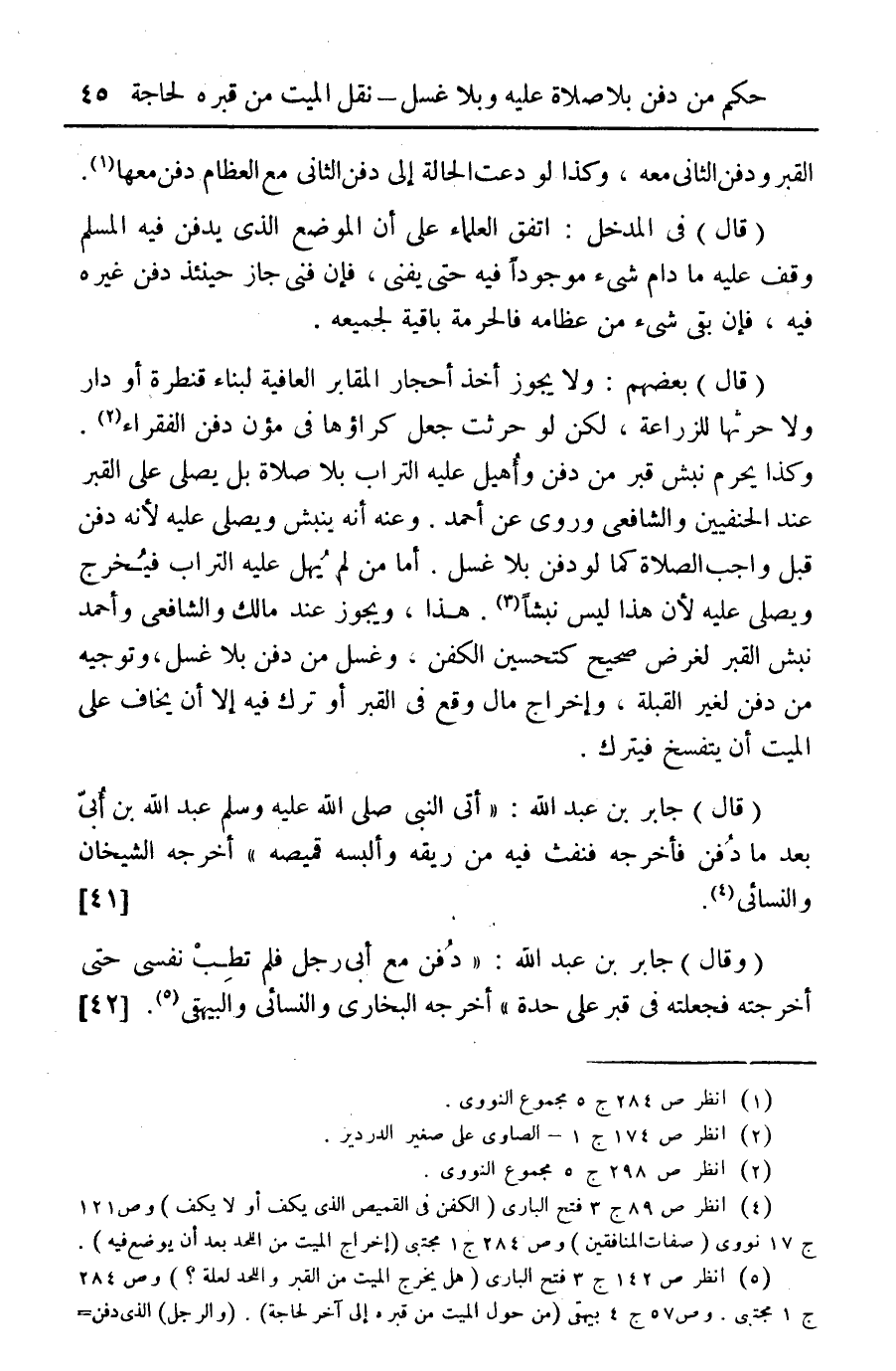 (¬5) انظر ص 142 ج 3 فتح الباري (هل يخرج الميت من القبر واللحد لعلة؟ ) وص 284 ج 1 مجتبي. وص 57 ج 4 بيهقي (من حول الميت من قبره إلى آخر لحاجة). (والرجل) الذي دفن مع أبي جابر هو عمرو بين الجموح بن زيد كان صديق عبد الله بن عمرو بن حرام والد جابر، دفن معه بأمر النبي صلى الله عليه وسلم (روى) محمد بن إسحاق عن أبيه عن أشياخ من الأنصار قالوا: أتى النبي صلى الله عليه وسلم يوم أحد بعبد الله بن عمرو بن حرام وعمرو بن الجموح ممثلين فقال: ادفنوهما في قبر واحد فإنهما كانا متصاحبين في الدنيا .. أخرجه ابن أبي شيبة (أنظر ص 56 ج 8 - الفتح الرباني- الشرح).