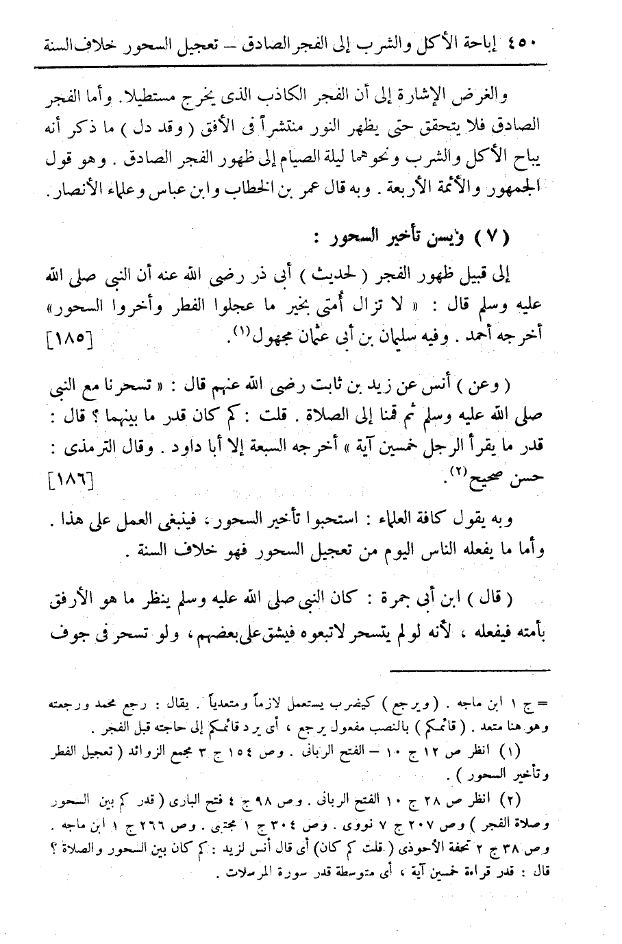 (¬2) انظر ص 28 ج 10 - الفتح الرباني. وص 98 ج 4 فتح الباري (قدركم بين السحور وصلاة الفجر) وص 207 ج 7 نووي. وص 304 ج 1 مجتبي. وص 266 ج 1 ابن ماجه. وص 38 ج 2 تحفة الأحوذي (قلت كم كان) أي قال أنس لزيد: كم كان بين السحور والصلاة؟ قال: قدر قراءة خمسين آية أي متوسطة قدر سورة المرسلات.