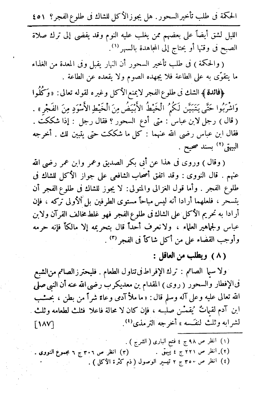 (فائدة) الشك في طلوع الفجر لا يمنع الأكل وغيره لقوله تعالى "وكلوا واشربوا حتى يتبين الخيط الأبيض من الخيط الأسود من الفجر". (قال) رجل لابن عباس متى أدع السحور؟ فقال رجل: إذا شككت. فقال ابن عباس رضي الله عنهما: كل ما شككت حتى يتبين لك. أخرجه البيهقي (¬2) بسند صحيح (وقال) وروي في هذا عن أبي بكر الصديق وعمر وابن عمر رضي الله عنهم. قال النووي وقد اتفق أصحاب الشافعي على جواز الأكل للشاك في طلوع الفجر وأما قول الغزالي والمتولي: لا يجوز للشاك في طلوع الفجر أن يتسحر فلعلهما أرادا أنه ليس مباحاً مستوى الطرفين بل الأولى تركه فإن أرادا به تحريم الأكل على الشاك في طلوع الفجر فهو غلط مخالف القرآن ولابن عباس ولجماهير العلماء ولا نعرف أحداً قال بتحريمه إلا مالكاً فإنه حرمه وأوجب القضاء على من أكل شاكاً في الفجر (¬3).