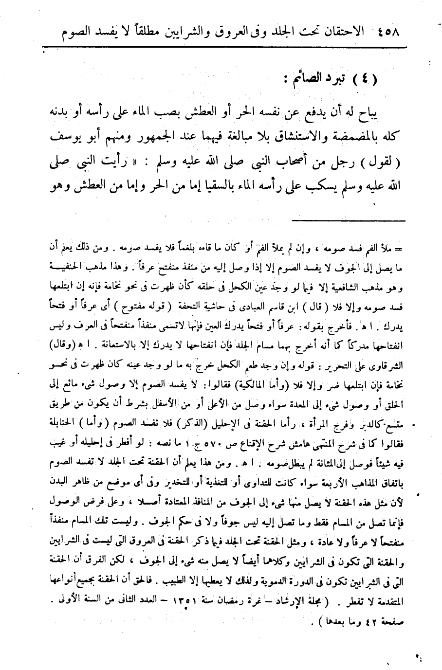 = ملأ الفم فسد صومه. وإن لم يملأ الفم أو كان ما قاءه بلغما فلا يفسد صومه. ومن ذلك يعلم أن ما يصل إلى الجوف لا يفسد الصوم إلا إذا وصل إليه من منفذ منفتح عرفاً. وهذا مذهب الحنفية وهو مذهب الشافعية إلا فيما لو وجد عين الكحل في حلقه كأن ظهرت في نحو نخامة فإنه إن ابتلعها فسد صومه وإلا فلا (قال) ابن قاسم العبادي في حاشية التحفة (قوله مفتوح) أي عرفاً أو فتحاً يدرك اهـ فأخرج بقوله: عرفاً أو فتحاً يدرك العين فإنها لا تسمى منفذاً منفتحاً في العرف وليس انفتاحها مدركاً كما أنه أخرج بهما مسام الجلد فإن انفتاحهما لا يدرك إلا بالاستعانة اهـ (وقال) الشرقاوي على التحرير قوله وإن وجد طعم الكحل خرج به ما لو وجد عينه كان ظهرت في نحو نخامة فإن ابتلعها ضر وإلا فلا (وأما المالكية) فقالوا لا يفسد الصوم إلا وصول شيء مائع إلى الحلق أو وصول شيء إلى المعدة سواء وصل من الأعلى أو من الأسفل بشرط أن يكون من طريق متسع كالدبر وفرج المرأة وأما الحقنة في الإحليل (الذكر) فلا تفسد الصوم (وأما) الحنابلة فقالوا كما في شرح المنتهي هامش شرح في الإقناع ص 570 ج 1 مانصه: لو أفطر في إحليله أو غيب فيه شيئاً فوصل إلى المثانة لم يبطل صومه اهـ ومن هذا يعلم أن الحقنة تحت الجلد لا تفسد الصوم باتفاق المذاهب الأربعة سواء كانت للتداوي أو للتغذية أو للتخدير وفي أي موضع من ظاهر البدن لأن مثل هذه الحقنة لا يصل منها شيء إلى الجوف من المنافذ المعتادة أصلاً وعلى فرض الوصول، فإنما تصل من المسام فقط وما تصل إليه ليس جوفاً ولا في حكم الجوف. وليست تلك المسام منفذاً منفتحاً لا عرفاً ولا عادة، ومثل الحقنة تحت الجلد فيما ذكر الحقنة في العروق التي ليست في الشرايين والحقنة التي تكون في الشرايين وكلاهما أيضاً لا يصل منه شيء إلى الجوف لكن الفرق أن الحقنة التي في الشرايين تكون في الدورة الدموية ولذلك لا يعطيها إلا الطبيب. فالحق أن الحقنة بجميع أنواعها المتقدمة لا تفخر. (مجلة الإرشاد غرة رمضان سنة 1351 - العدد الثاني من السنة الأولى. صفحة 42 وما بعدها).