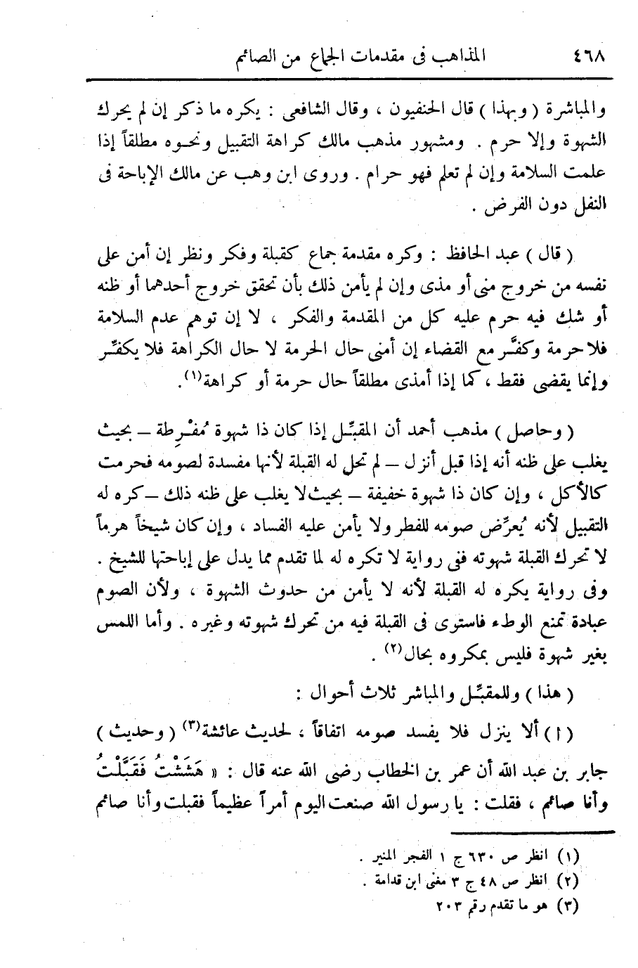 (هذا) وللمقبل والمباشر ثلاث أحوال: (أ) ألا ينزل فلا يفسد صومه اتفاقاً لحديث عائشة (¬3) (وحديث) جابر بن عبد الله أن عمر بن الخطاب رضي الله عنه قال: "هششت فقبلت وأنا صائم فقلت: يا رسول الله صنعت اليوم أمراً عظيماً فقبلت وأنا صائم