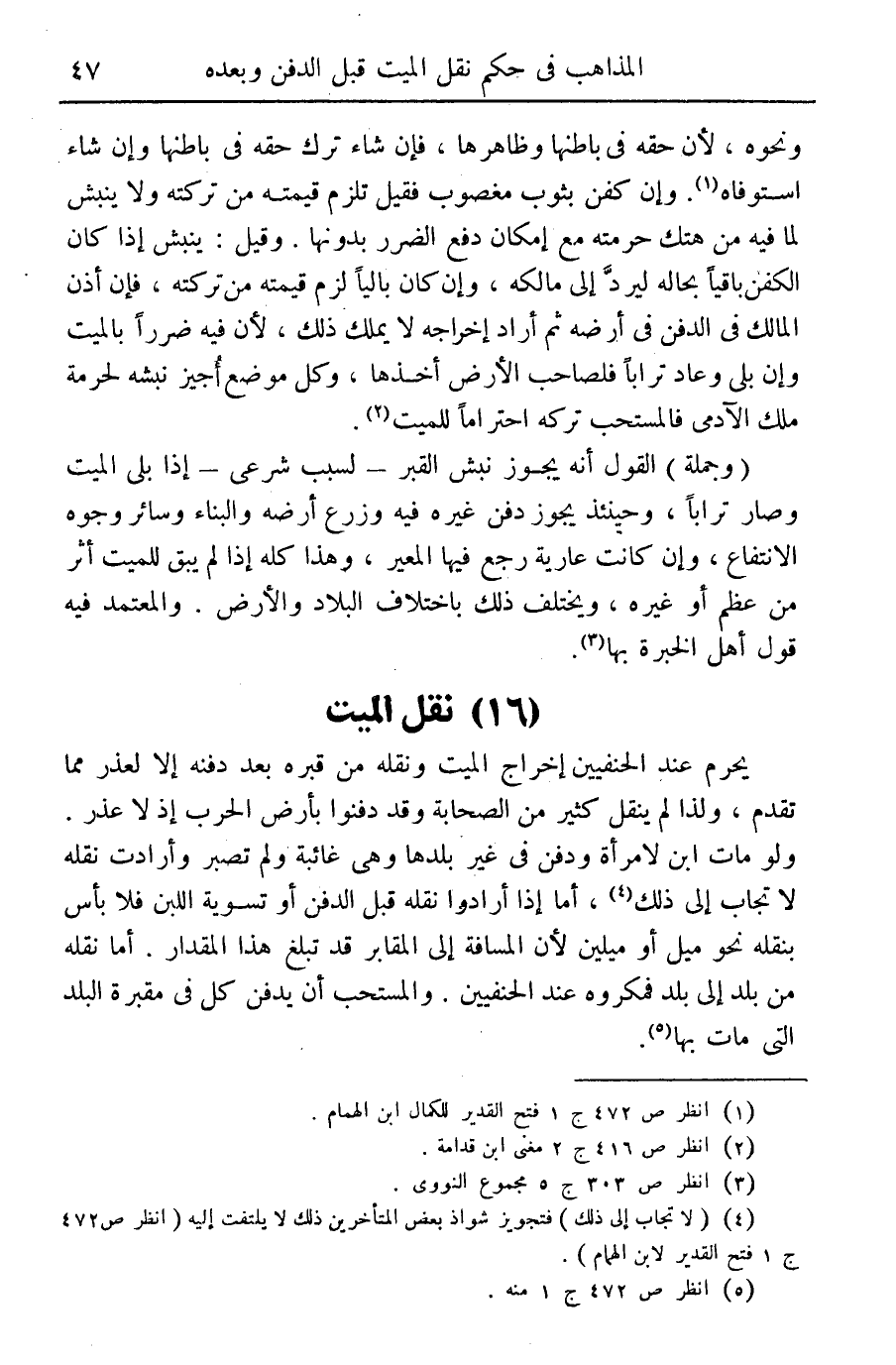 يحرم عند الحنفيين إخراج الميت ونقله من قبره بعد دفنه إلا لعذر مما تقدم، ولذا لم ينقل كثير من الصحابة وقد دفنوا بأرض الحرب إذ لا عذر. ولو مات ابن لامرأة ودفن في غير بلدها وهي غائبة ولم تصبر وأرادت نقله لا تجاب إلى ذلك (¬4)، أما إذا أرادوا نقله قبل الدفن أو تسوية اللبن فلا بأس بنقله نحو ميل أو ميلين لأن المسافة إلى المقابر قد تبلغ هذا المقدار. أما نقله من بلد إلى بلد فمكروه عند الحنفيين. والمستحب أن يدفن كل في مقبرة البلد التي مات بها (¬5).