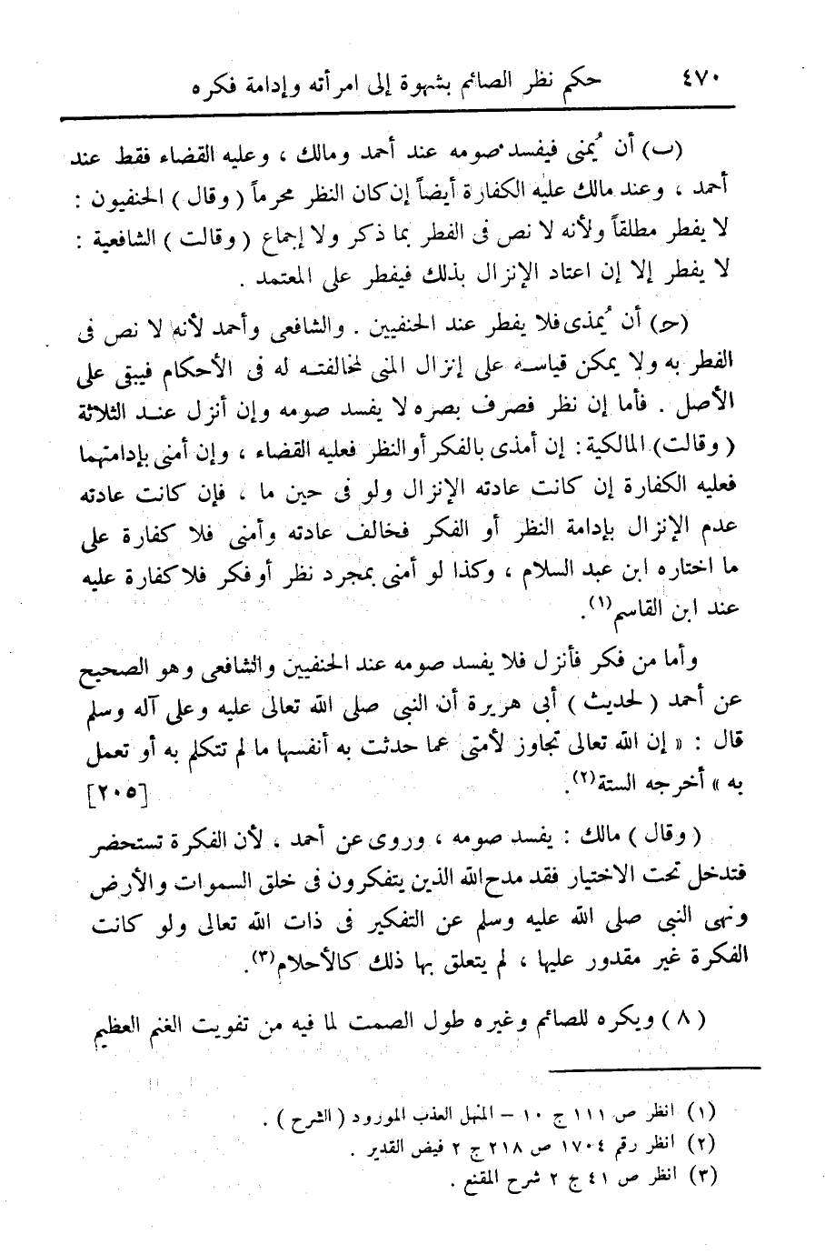 وأما من فكر فأنزل فلا يفسد صومه عند الحنفيين والشافعي وهو الصحيح عن أحمد (لحديث) أبى هريرة أن النبي صلى الله تعالى عليه وعلى آله وسلم قال: "إن الله تعالى تجاوز لأمتي عما حدثت به أنفسهما ما لم تتكلم به أو تعمل به" أخرجه الستة (¬2) {205}