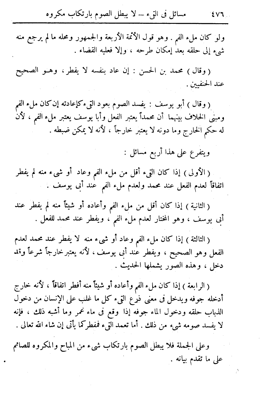 (الأولى) إذا كان القيء أقل من ملء الفم وعاد أو شيء منه لم يفطر اتفاقاً لعدم الفعل عند محمد ولعدم ملء الفم عند أبي يوسف (الثانية) إذا كان أقل من ملء الفم وأعاده أو شيئاً منه لم يفطر عند أبي يوسف وهو المختار لعدم ملء الفم ويفطر عند محمد للفعل.